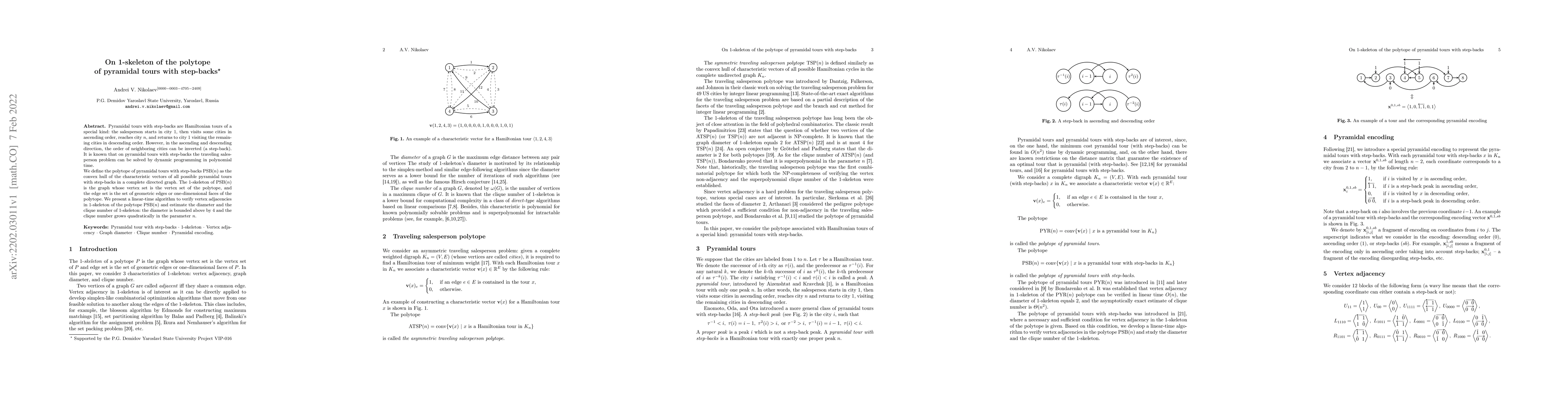 Pyramidal tours with step-backs are Hamiltonian tours of a special kind: the salesperson starts in city 1, then visits some cities in ascending order, reaches city $n$, and returns to city 1 visiting the remaining cities in descending order. However, in the ascending and descending direction, the order of neighboring cities can be inverted (a step-back). It is known that on pyramidal tours with step-backs the traveling salesperson problem can be solved by dynamic programming in polynomial time. We define the polytope of pyramidal tours with step-backs $\operatorname{PSB}(n)$ as the convex hull of the characteristic vectors of all possible pyramidal tours with step-backs in a complete directed graph. The 1-skeleton of $\operatorname{PSB}(n)$ is the graph whose vertex set is the vertex set of the polytope, and the edge set is the set of geometric edges or one-dimensional faces of the polytope. We present a linear-time algorithm to verify vertex adjacencies in 1-skeleton of the polytope $\operatorname{PSB}(n)$ and estimate the diameter and the clique number of 1-skeleton: the diameter is bounded above by 4 and the clique number grows quadratically in the parameter $n$.