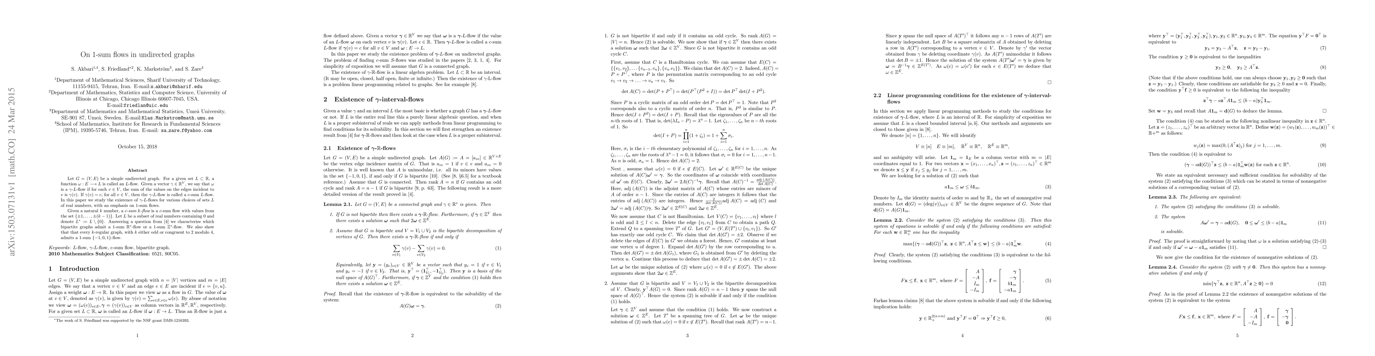 This paper studies the existence of flow functions in undirected graphs that allocate values from a set to edges, focusing on 1-sum flows and their applications in bipartite graphs and k-regular graphs.