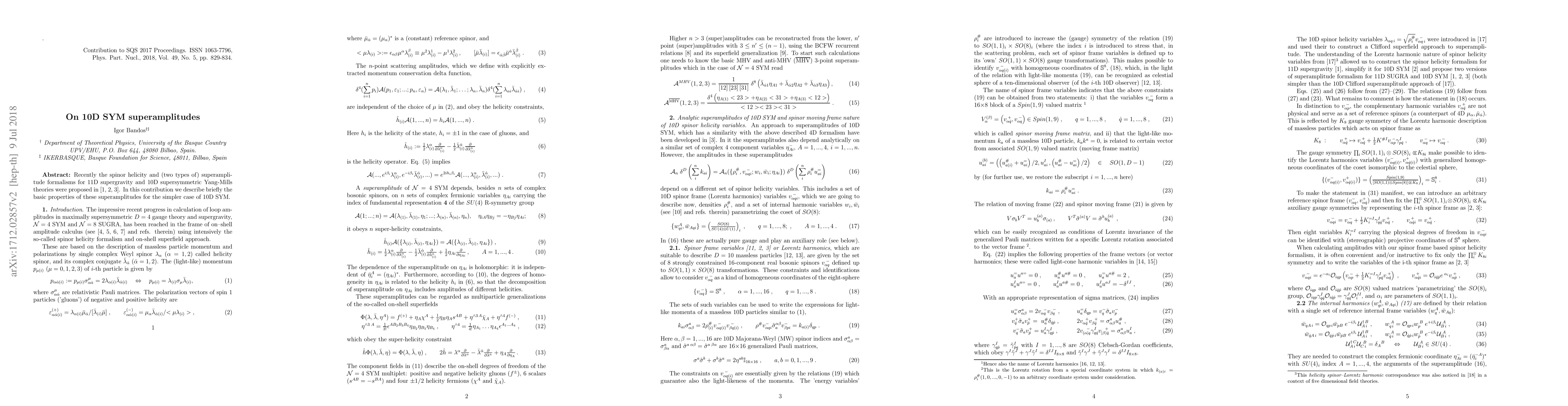 Recently the spinor helicity and (two types of) superamplitude formalisms for 11D supergravity and 10D supersymmetric Yang-Mills theories were proposed in [1,2,3]. In this contribution we describe briefly the basic properties of these superamplitudes for the simpler case of 10D SYM.