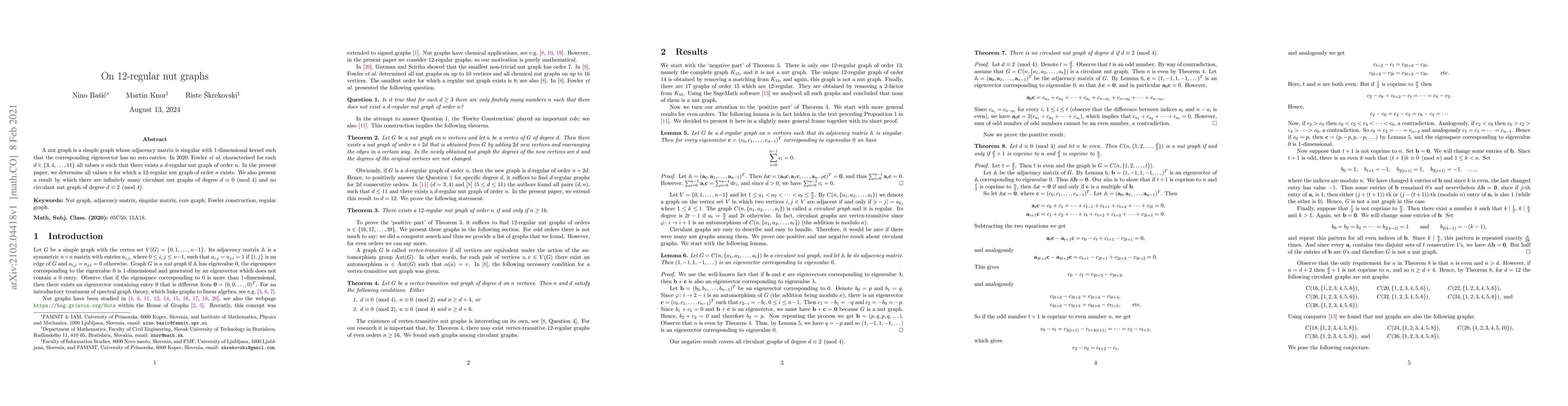 A nut graph is a simple graph whose adjacency matrix is singular with $1$-dimensional kernel such that the corresponding eigenvector has no zero entries. In 2020, Fowler et al. characterised for each $d \in \{3,4,\ldots,11\}$ all values $n$ such that there exists a $d$-regular nut graph of order $n$. In the present paper, we determine all values $n$ for which a $12$-regular nut graph of order $n$ exists. We also present a result by which there are infinitely many circulant nut graphs of degree $d \equiv 0 \pmod 4$ and no circulant nut graph of degree $d \equiv 2 \pmod 4$.
