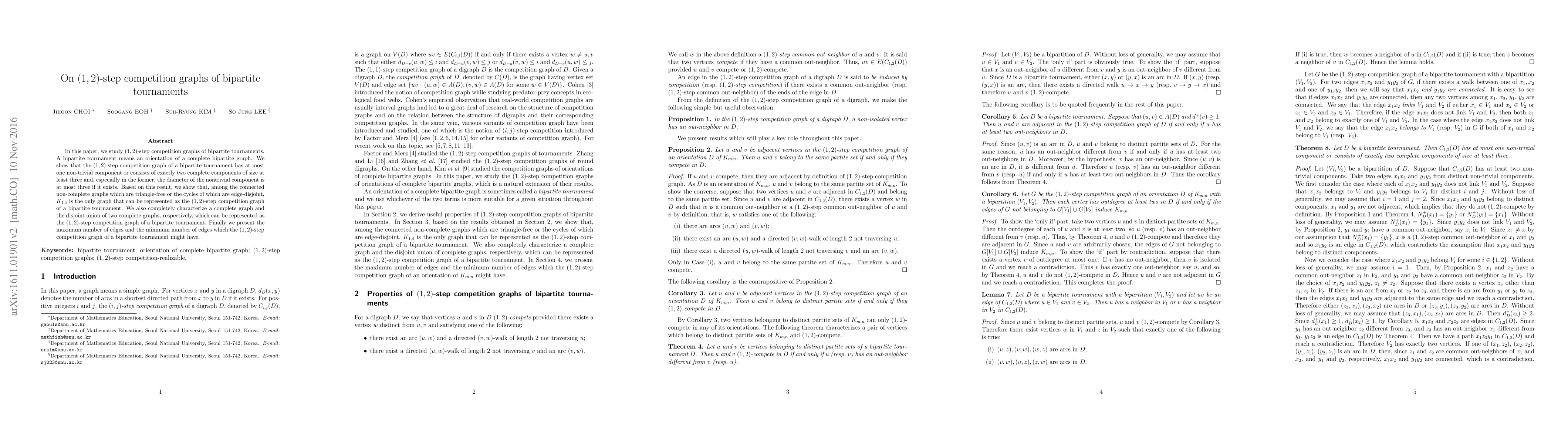 This paper examines $(1,2)$-step competition graphs derived from bipartite tournaments, demonstrating that such graphs have at most one non-trivial component or consist of two complete components of size at least three, with the nontrivial component having a diameter of at most three if present. It concludes that $K_{1,4}$ is the only connected, non-complete, triangle-free or edge-disjoint cycle graph representable as such a competition graph.