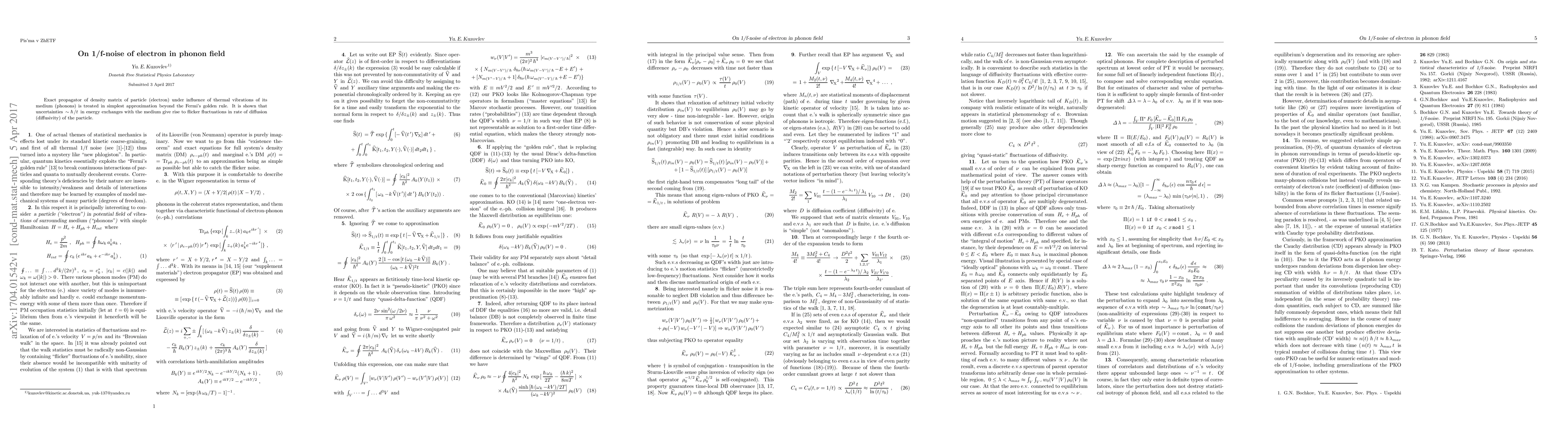 Exact propagator of density matrix of particle (electron) under influence of thermal vibrations of its medium (phonons) is treated in simplest approximation beyond the Fermi's golden rule. It is shown that uncertainties \,$\sim\h/t$\, in energy exchanges with the medium give rise to flicker fluctuations in rate of diffusion (diffusivity) of the particle