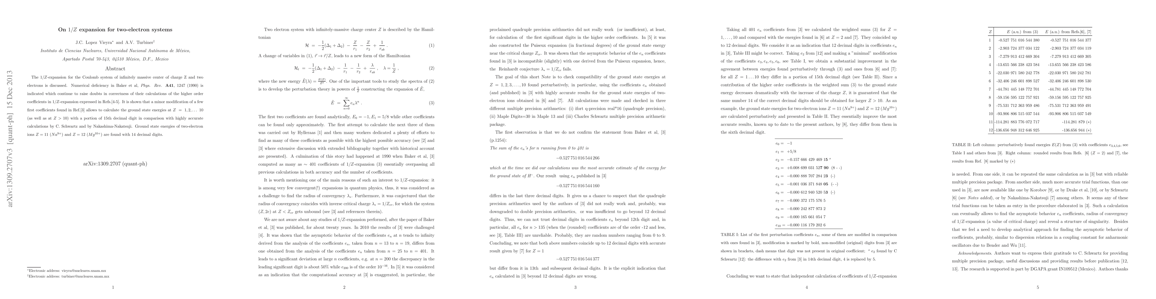 The $1/Z$-expansion for the Coulomb system of infinitely massive center of charge Z and two electrons is discussed. Numerical deficiency in Baker et al, {\em Phys. Rev. \bf A41}, 1247 (1990) is indicated which continue to raise doubts in correctness of their calculations of the higher order coefficients in $1/Z$-expansion expressed in Refs.[4-5]. It is shown that a minor modification of a few first coefficients found in Ref.[3] allows to calculate the ground state energies at $Z\ =\ 1, 2,\ldots \ 10$ (as well as at $Z > 10$) with a portion of 15th decimal digit in comparison with highly accurate calculations by C. Schwartz and by Nakashima-Nakatsuji. Ground state energies of two-electron ions $Z=11\ (Na^{9+})$ and $Z=12\ (Mg^{10+})$ are found with 14 decimal digits.