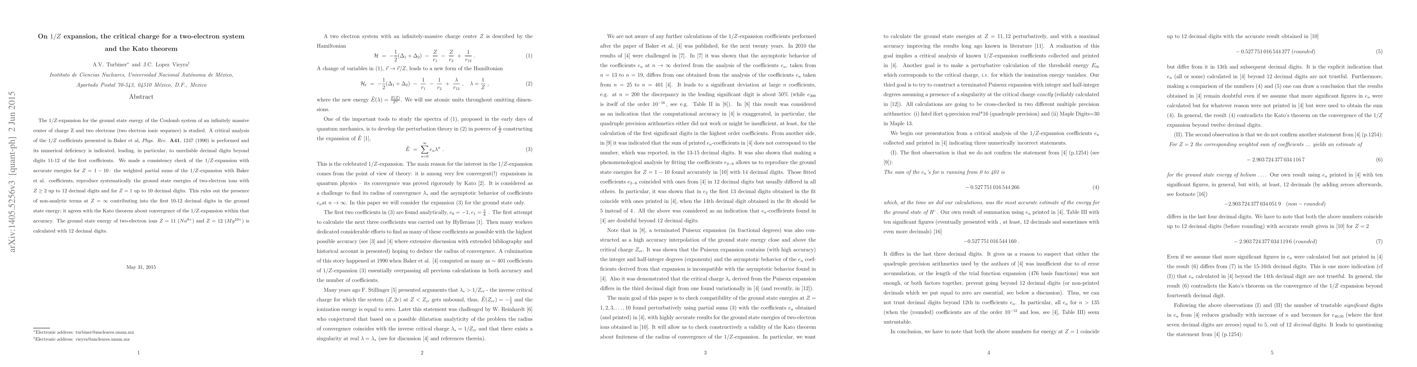 The $1/Z$-expansion for the ground state energy of the Coulomb system of an infinitely massive center of charge Z and two electrons (two electron ionic sequence) is studied. A critical analysis of the $1/Z$ coefficients presented in Baker et al, {\em Phys. Rev. \bf A41}, 1247 (1990) is performed and its numerical deficiency is indicated, leading, in particular, to unreliable decimal digits beyond digits 11-12 of the first coefficients. We made a consistency check of the $1/Z$-expansion with accurate energies for $Z = 1 - 10$: the weighted partial sums of the $1/Z$-expansion with Baker et al. coefficients, reproduce systematically the ground state energies of two-electron ions with $Z \geq 2$ up to 12 decimal digits and for $Z=1$ up to 10 decimal digits. This rules out the presence of non-analytic terms at $Z=\infty$ contributing into the first 10-12 decimal digits in the ground state energy; it agrees with the Kato theorem about convergence of the $1/Z$-expansion within that accuracy. The ground state energy of two-electron ions $Z=11\ (Na^{9+})$ and $Z=12\ (Mg^{10+})$ is calculated with 12 decimal digits.