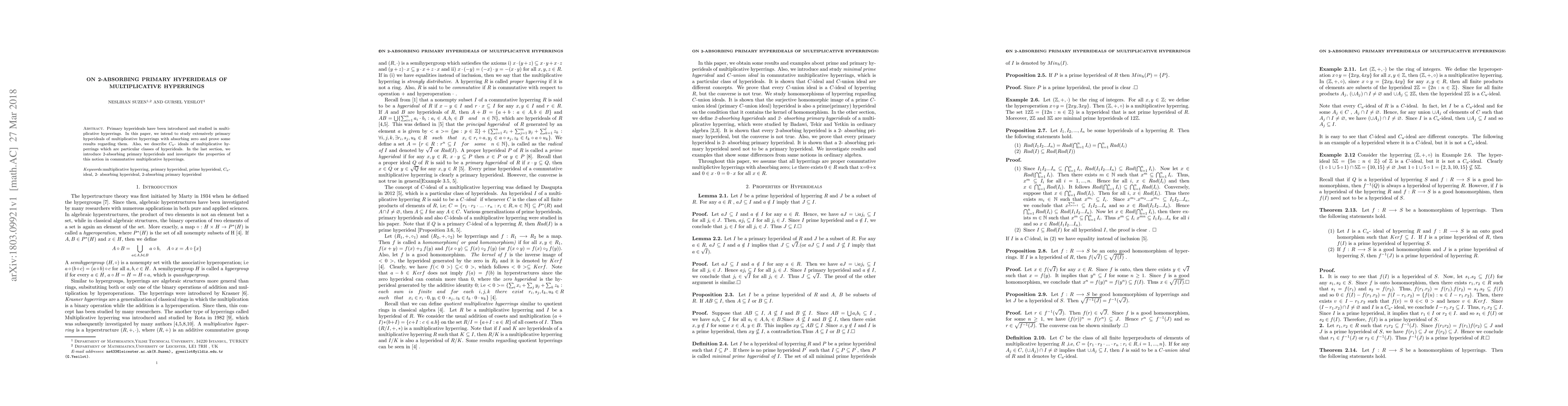 This paper studies primary hyperideals in multiplicative hyperrings with absorbing zero, introduces Cu-ideals, and explores 2-absorbing primary hyperideals in commutative multiplicative hyperrings, proving relevant properties.