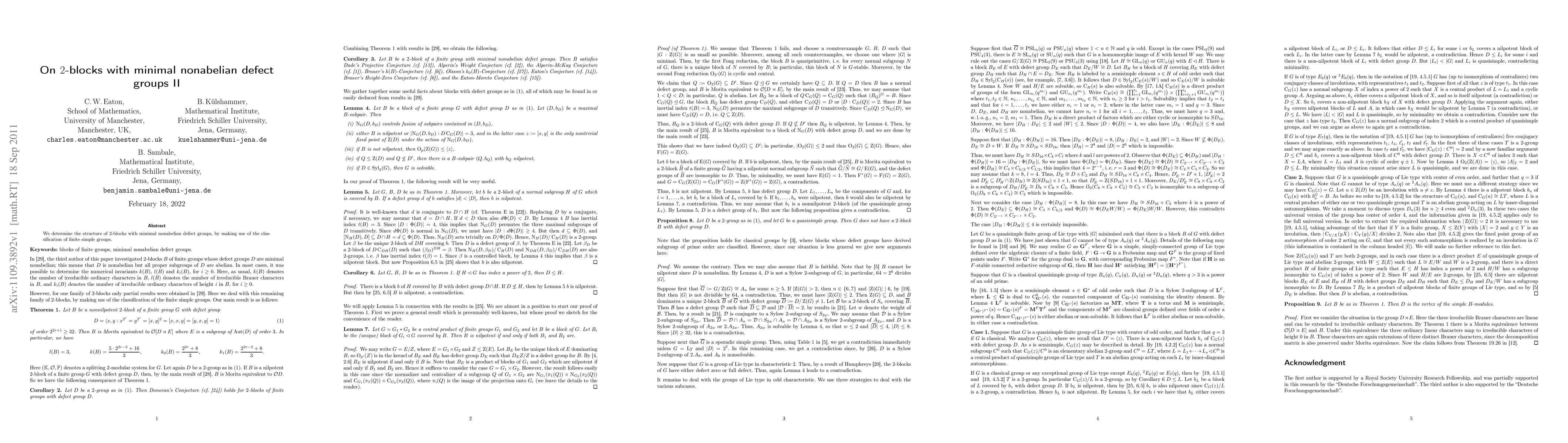 Summary: This paper investigates the structure of 2-blocks in finite groups with minimal nonabelian defect groups, utilizing the classification of finite simple groups to achieve its findings. The results provide deeper insights into the algebraic properties of these blocks.