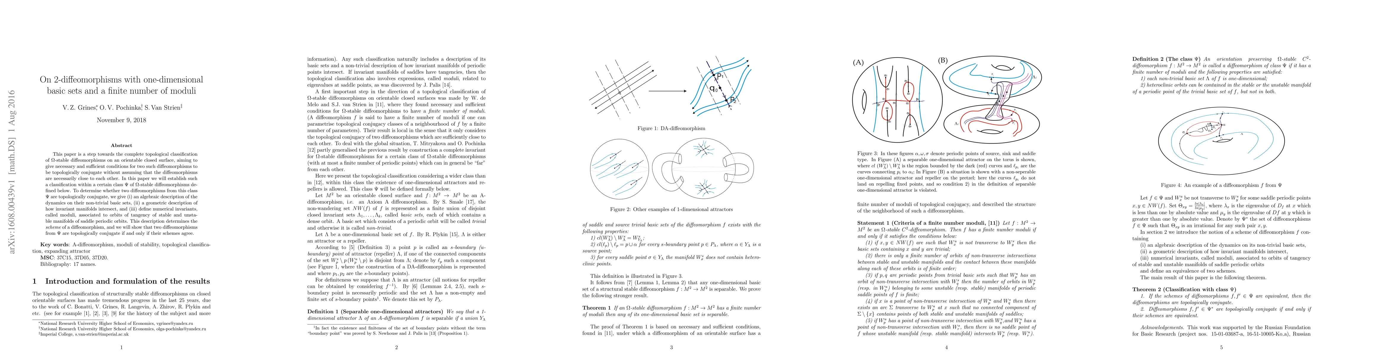 This paper is a step towards the complete topological classification of {\Omega}-stable diffeomorphisms on an orientable closed surface, aiming to give necessary and sufficient conditions for two such diffeomorphisms to be topologically conjugate without assuming that the diffeomorphisms are necessarily close to each other. In this paper we will establish such a classification within a certain class {\Psi} of {\Omega}-stable diffeomorphisms de- fined below. To determine whether two diffeomorphisms from this class {\Psi} are topologically conjugate, we give (i) an algebraic description of the dynamics on their non-trivial basic sets, (ii) a geometric description of how invariant manifolds intersect, and (iii) define numerical invariants, called moduli, associated to orbits of tangency of stable and unsta- ble manifolds of saddle periodic orbits. This description determines the scheme of a diffeomorphism, and we will show that two diffeomorphisms from {\Psi} are topologically conjugate if and only if their schemes agree.