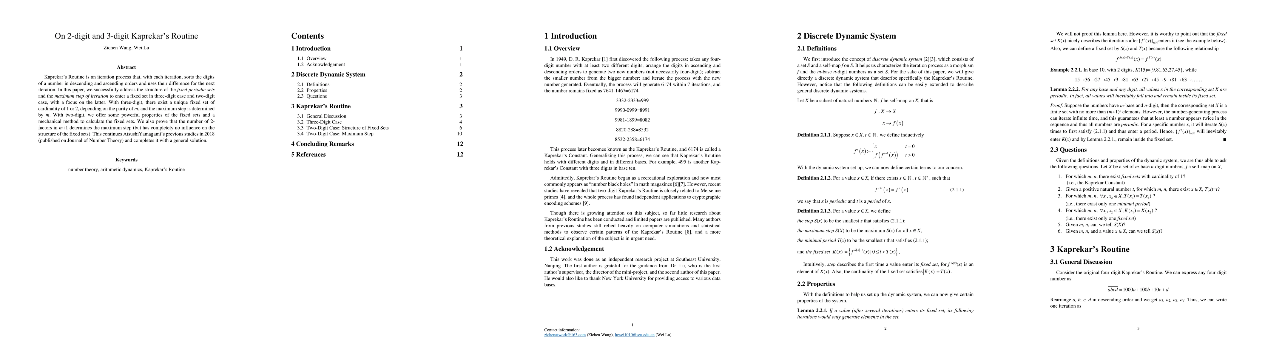 This paper studies Kaprekar's Routine for 2-digit and 3-digit numbers, finding unique fixed sets and maximum steps for iteration. It provides a general solution to the problem, building on previous research by Atsushi Yamagami.