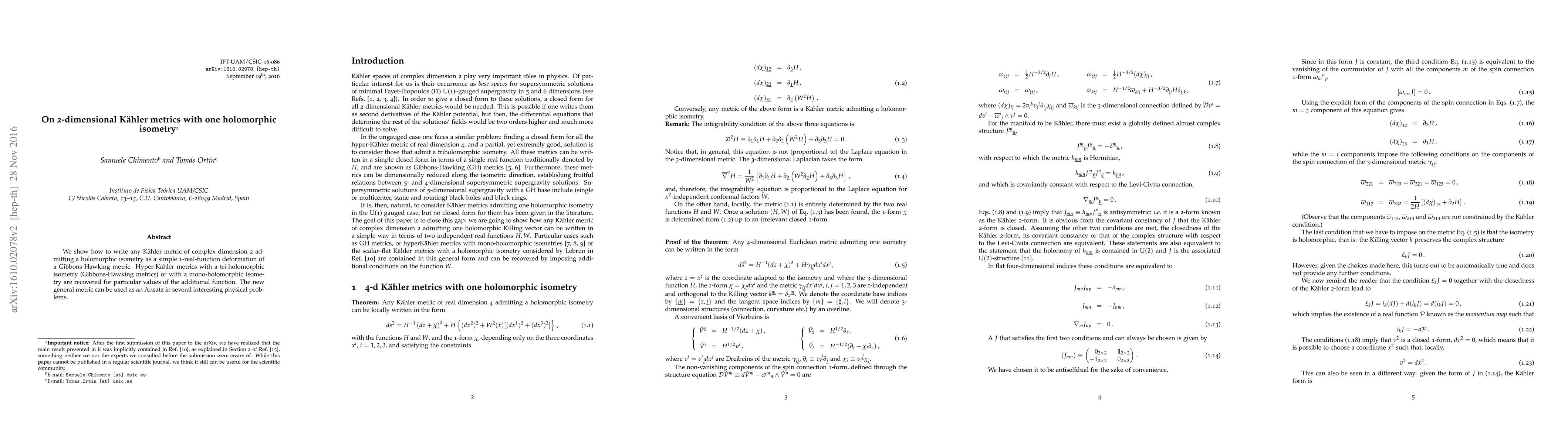 This paper demonstrates that any 2-dimensional Kaehler metric with a holomorphic isometry can be expressed as a deformation of a Gibbons-Hawking metric, with specific cases recovering hyper-Kaehler metrics. The new general metric serves as a useful Ansatz for various physical problems.
