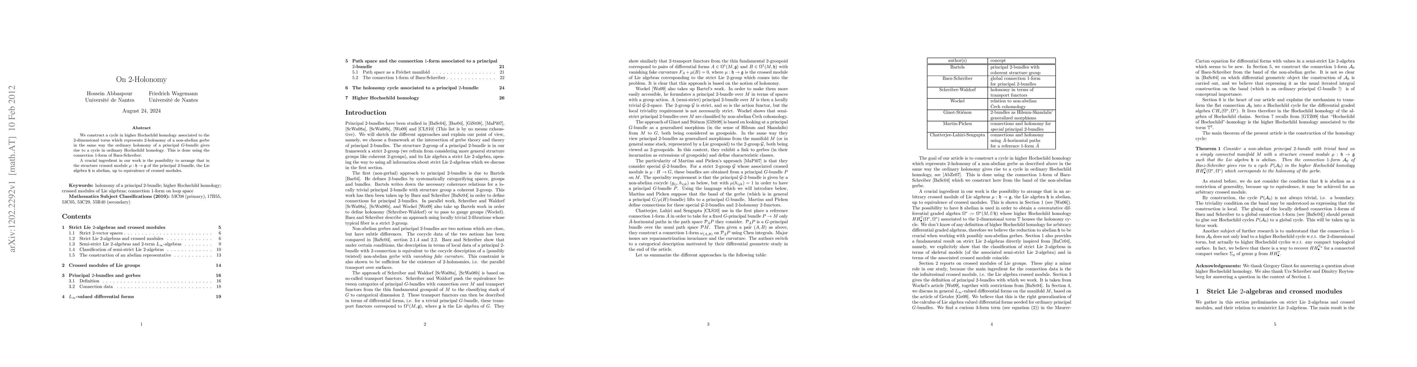 We construct a cycle in higher Hochschild homology associated to the 2-dimensional torus which represents 2-holonomy of a non-abelian gerbe in the same way the ordinary holonomy of a principal G-bundle gives rise to a cycle in ordinary Hochschild homology. This is done using the connection 1-form of Baez-Schreiber. A crucial ingredient in our work is the possibility to arrange that in the structure crossed module mu: g -> h of the principal 2-bundle, the Lie algebra h is abelian, up to equivalence of crossed modules.