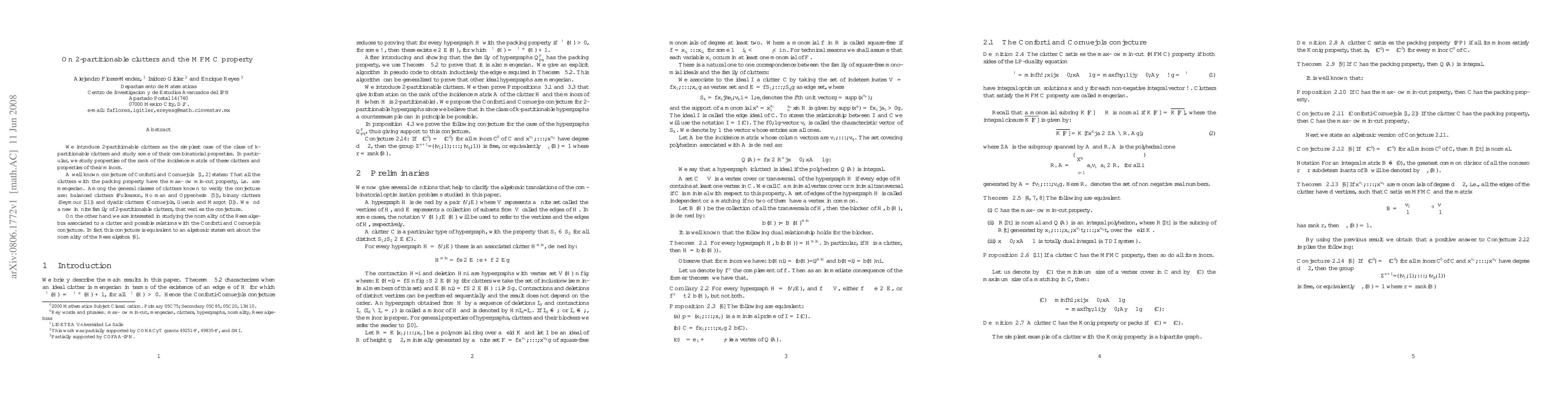 We introduce 2-partitionable clutters as the simplest case of the class of $k$-partitionable clutters and study some of their combinatorial properties. In particular, we study properties of the rank of the incidence matrix of these clutters and properties of their minors. A well known conjecture of Conforti and Cornu\'ejols \cite{ConfortiCornuejols,cornu-book} states: That all the clutters with the packing property have the max-flow min-cut property, i.e. are mengerian. Among the general classes of clutters known to verify the conjecture are: balanced clutters (Fulkerson, Hoffman and Oppenheim \cite{FulkersonHoffmanOppenheim}), binary clutters (Seymour \cite{Seymour}) and dyadic clutters (Cornu\'ejols, Guenin and Margot \cite{CornuejolsGueninMargot}). We find a new infinite family of 2-partitionable clutters, that verifies the conjecture. On the other hand we are interested in studying the normality of the Rees algebra associated to a clutter and possible relations with the Conforti and Cornu\'ejols conjecture. In fact this conjecture is equivalent to an algebraic statement about the normality of the Rees algebra \cite{rocky}.