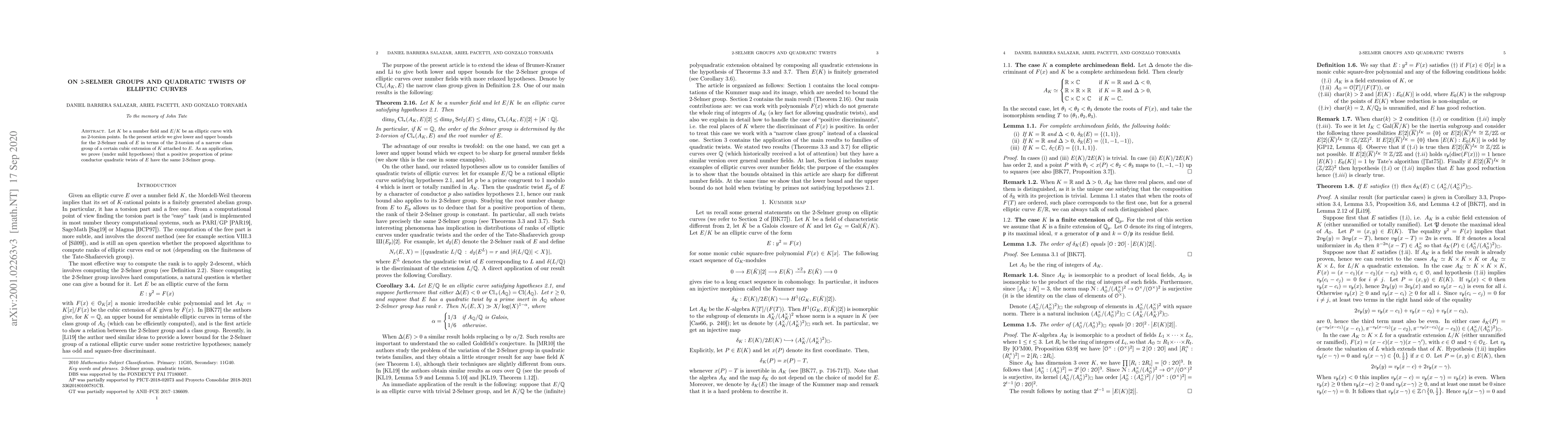 The paper provides bounds for the $2$-Selmer rank of elliptic curves $E$ over number fields $K$ in relation to the $2$-torsion of a narrow class group from a specific cubic extension tied to $E$. It also proves that, under mild conditions, a significant proportion of quadratic twists of $E$ share the same $2$-Selmer group.