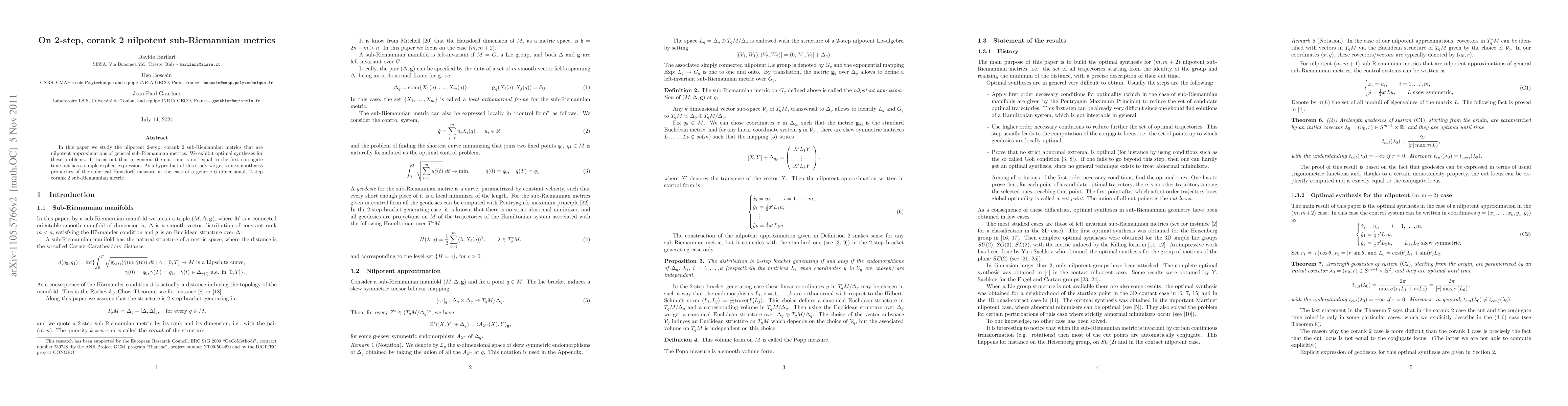 This paper investigates nilpotent 2-step, corank 2 sub-Riemannian metrics and their nilpotent approximations, presenting optimal syntheses and revealing that the cut time differs from the first conjugate time with a specific formula. Additionally, it uncovers smoothness properties of the spherical Hausdorff measure for a typical 6-dimensional, 2-step corank 2 sub-Riemannian metric.