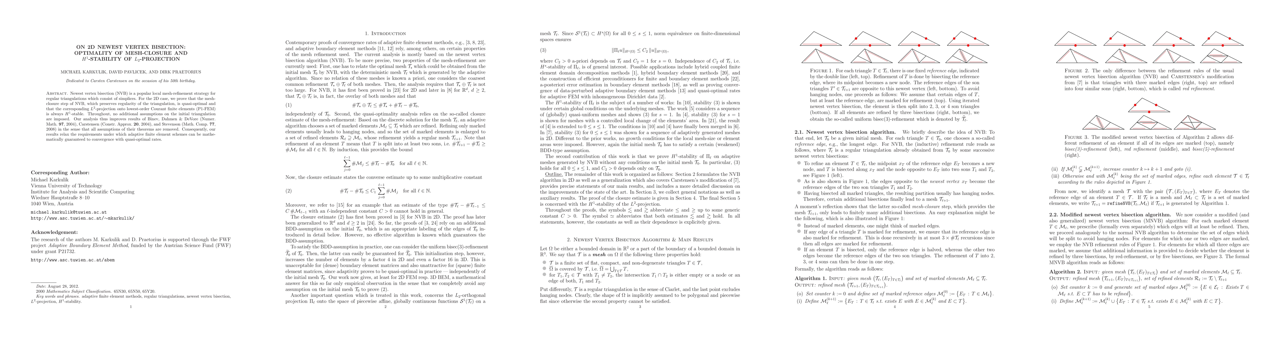 Newest vertex bisection (NVB) is a popular local mesh-refinement strategy for regular triangulations which consist of simplices. For the 2D case, we prove that the mesh-closure step of NVB, which preserves regularity of the triangulation, is quasi-optimal and that the corresponding L2-projection onto lowest-order Courant finite elements (P1-FEM) is always H1-stable. Throughout, no additional assumptions on the initial triangulation are imposed. Our analysis thus improves results of Binev, Dahmen & DeVore (Numer. Math. 97, 2004), Carstensen (Constr. Approx. 20, 2004), and Stevenson (Math. Comp. 77, 2008) in the sense that all assumptions of their theorems are removed. Consequently, our results relax the requirements under which adaptive finite element schemes can be mathematically guaranteed to convergence with quasi-optimal rates.