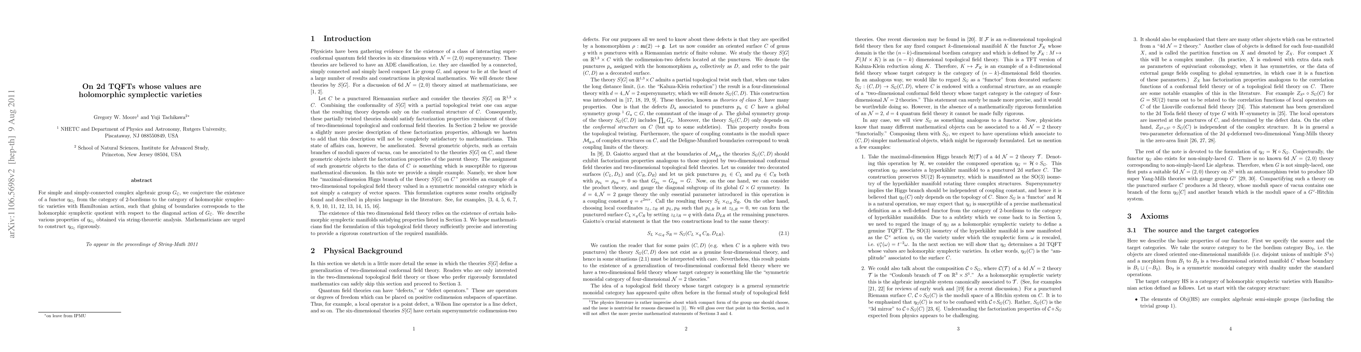 For simple and simply-connected complex algebraic group G, we conjecture the existence of a functor eta_G from the category of 2-bordisms to the category of holomorphic symplectic varieties with Hamiltonian action, such that gluing of boundaries corresponds to the holomorphic symplectic quotient with respect to the diagonal action of G. We describe various properties of eta_G obtained via string-theoretic analysis. Mathematicians are urged to construct eta_G rigorously.