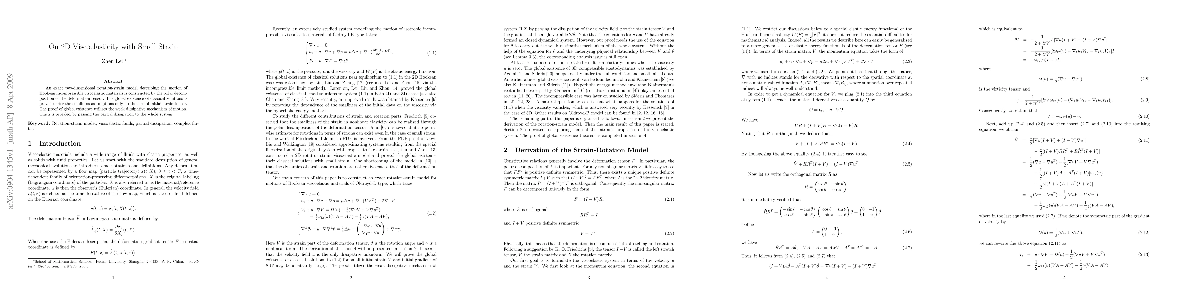 An exact two-dimensional rotation-strain model describing the motion of Hookean incompressible viscoelastic materials is constructed by the polar decomposition of the deformation tensor. The global existence of classical solutions is proved under the smallness assumptions only on the size of initial strain tensor. The proof of global existence utilizes the weak dissipative mechanism of motion, which is revealed by passing the partial dissipation to the whole system.