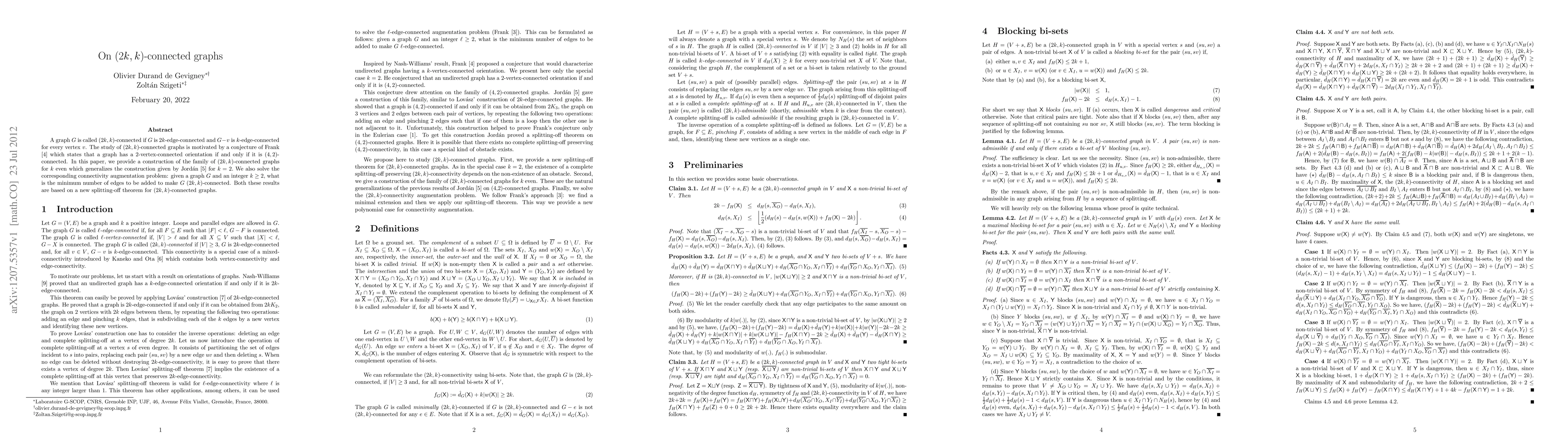 A graph G is called (2k, k)-connected if G is 2k-edge-connected and G-v is k-edge-connected for every vertex v. The study of (2k, k)-connected graphs is motivated by a conjecture of Frank which states that a graph has a 2-vertex-connected orientation if and only if it is (4, 2)-connected. In this paper, we provide a construction of the family of (2k, k)-connected graphs for k even which generalizes the construction given by Jord\'an for k = 2. We also solve the corresponding connectivity augmentation problem: given a graph G and an integer k \geq 2, what is the minimum number of edges to be added to make G (2k, k)-connected. Both these results are based on a new splitting-off theorem for (2k, k)-connected graphs.