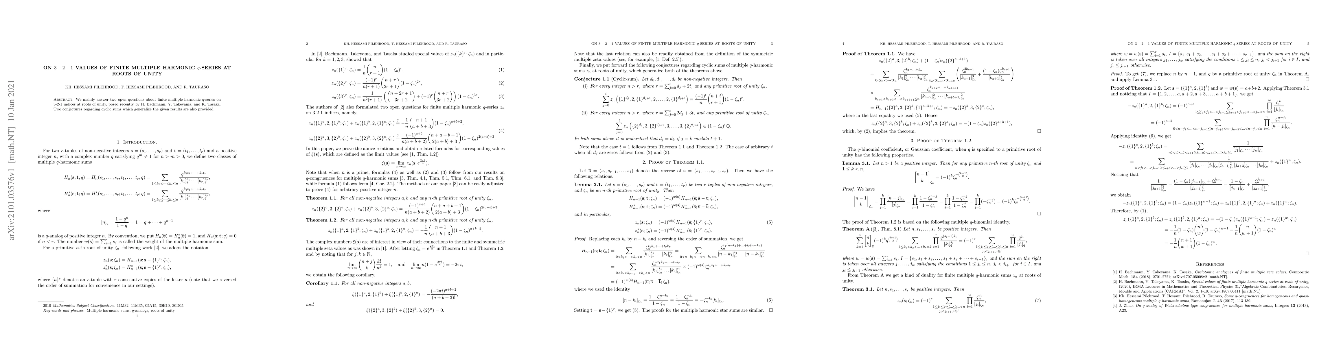 Summary: This paper resolves two open questions regarding finite multiple harmonic $q$-series on 3-2-1 indices at roots of unity, extending recent conjectures by Bachmann, Takeyama, and Tasaka, and introduces additional conjectures on cyclic sums.