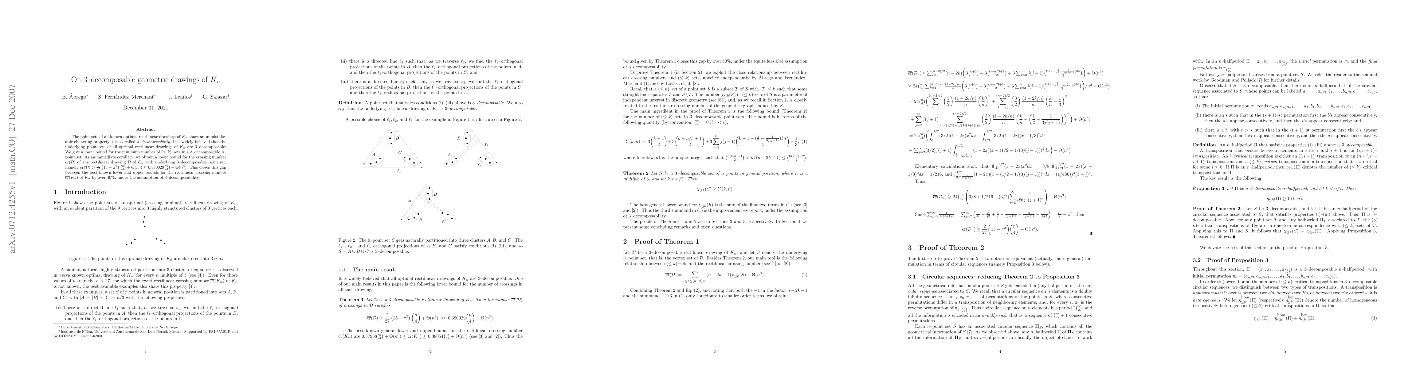 The point sets of all known optimal rectilinear drawings of $K_n$ share an unmistakeable clustering property, the so--called {\em 3--decomposability}. It is widely believed that the underlying point sets of all optimal rectilinear drawings of $K_n$ are 3--decomposable. We give a lower bound for the minimum number of $(\le k)$--sets in a 3--decomposable $n$--point set. As an immediate corollary, we obtain a lower bound for the crossing number $\rcr(\dd)$ of any rectilinear drawing $\dd$ of $K_n$ with underlying 3--decomposable point set, namely $\rcr(\dd) > {2/27}(15-\pi^{2})\binom{n}{4}+\Theta(n^{3}) \approx 0.380029\binom{n}{4} + \Theta(n^3)$. This closes this gap between the best known lower and upper bounds for the rectilinear crossing number $\rcr(K_n)$ of $K_n$ by over 40%, under the assumption of 3--decomposability.