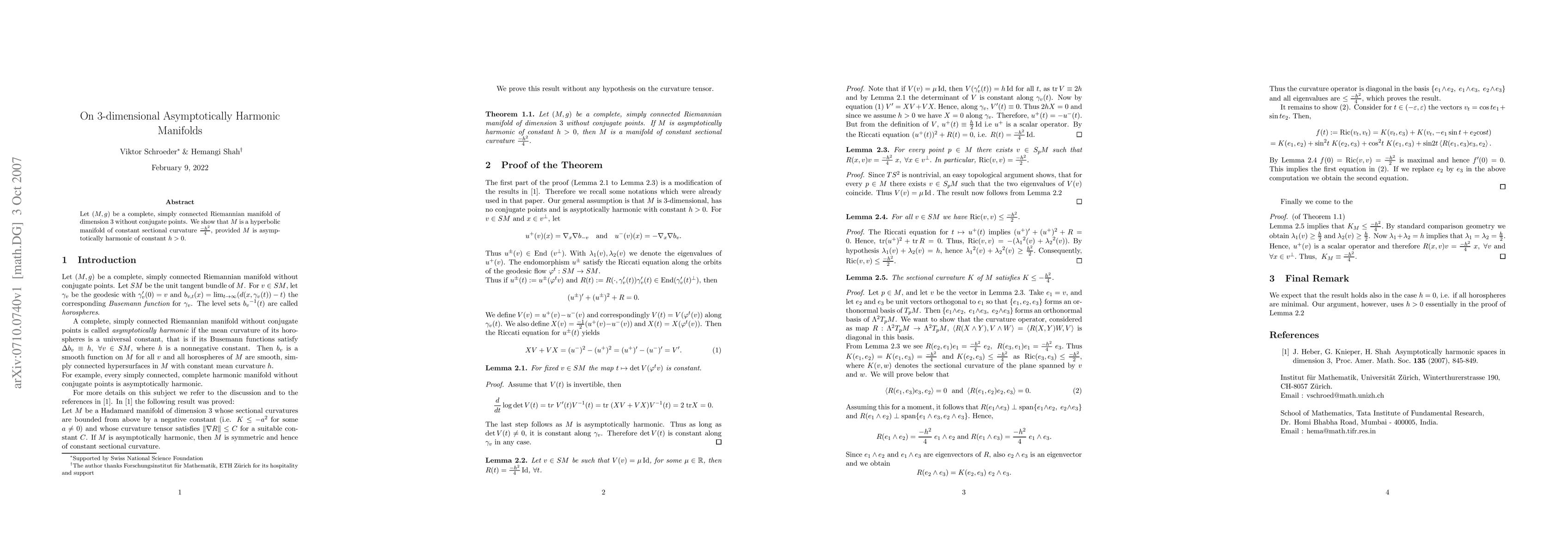 Researchers prove that 3D manifolds without conjugate points with positive asymptotic harmonicity have constant sectional curvature, making them hyperbolic manifolds.
