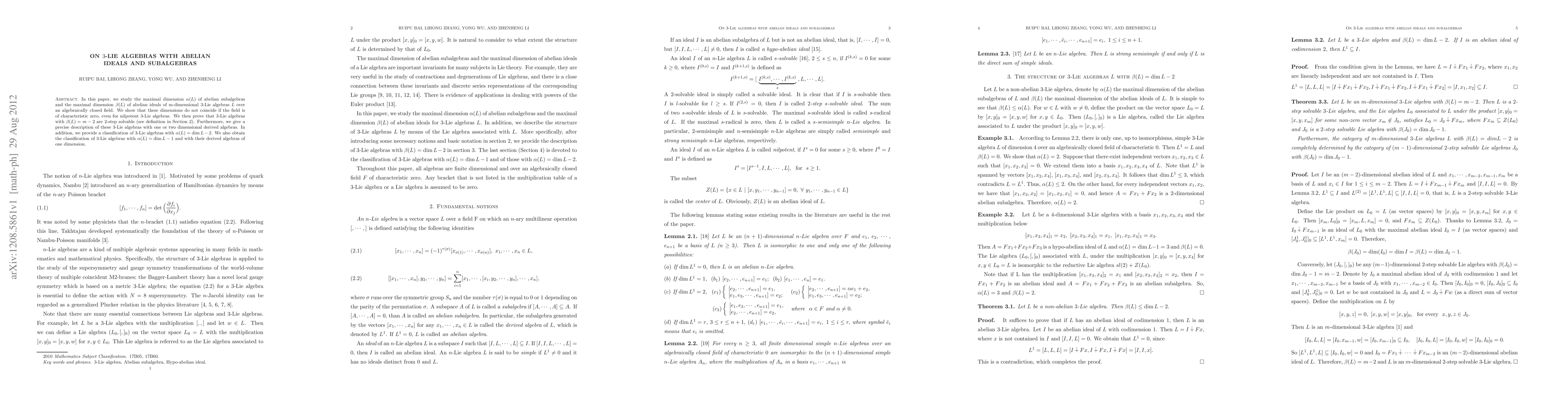 This paper investigates the maximal dimensions of abelian subalgebras and ideals in 3-Lie algebras over an algebraically closed field, demonstrating they differ in characteristic zero. It classifies 3-Lie algebras with specific properties regarding their abelian subalgebras and ideals, particularly focusing on those with derived algebras of one dimension.