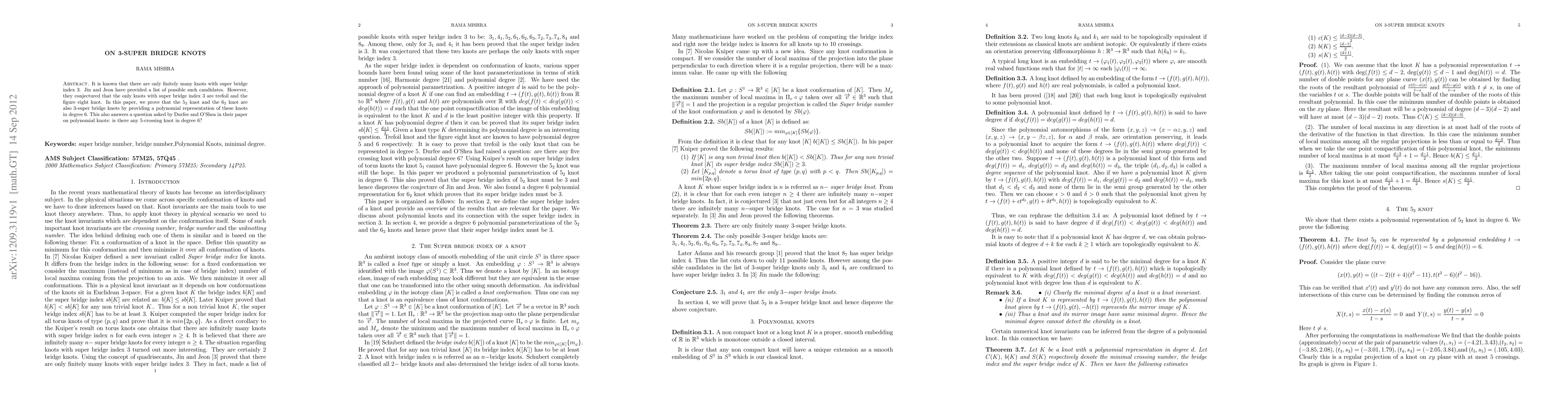 This paper confirms that the $5_2$ and $6_2$ knots are 3-super bridge knots, thus expanding the known list beyond just the trefoil and the figure eight knot. It provides a polynomial representation of these knots in degree 6, answering a question posed by Durfee and O'Shea regarding 5-crossing knots.