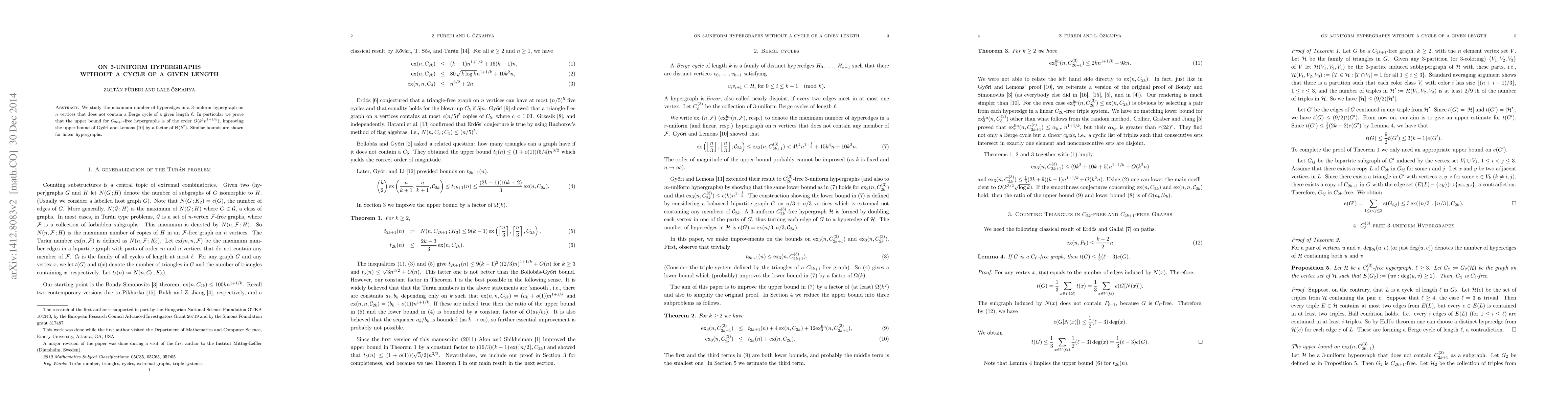 Researchers found that the maximum number of hyperedges in a 3-uniform hypergraph without a cycle of a given length is improved to O(k^2n^(1+1/k)) by their study, which improves previous bounds by a factor of Θ(k^2).