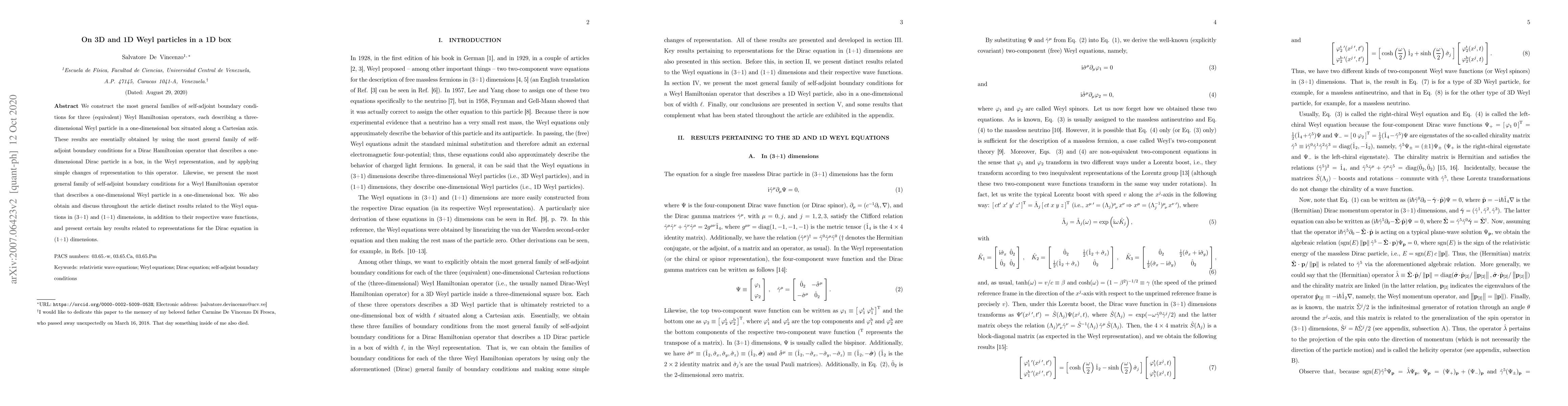 We construct the most general families of self-adjoint boundary conditions for three (equivalent) Weyl Hamiltonian operators, each describing a three-dimensional Weyl particle in a one-dimensional box situated along a Cartesian axis. These results are essentially obtained by using the most general family of self-adjoint boundary conditions for a Dirac Hamiltonian operator that describes a one-dimensional Dirac particle in a box, in the Weyl representation, and by applying simple changes of representation to this operator. Likewise, we present the most general family of self-adjoint boundary conditions for a Weyl Hamiltonian operator that describes a one-dimensional Weyl particle in a one-dimensional box. We also obtain and discuss throughout the article distinct results related to the Weyl equations in (3+1) and (1+1) dimensions, in addition to their respective wave functions, and present certain key results related to representations for the Dirac equation in (1+1) dimensions.