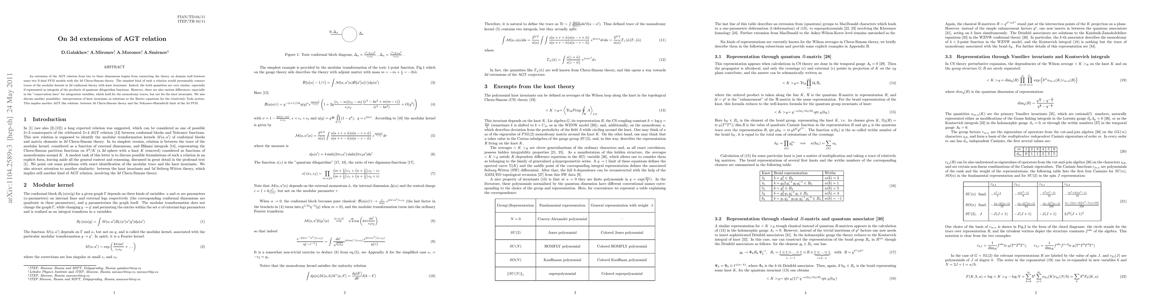 An extension of the AGT relation from two to three dimensions begins from connecting the theory on domain wall between some two S-dual SYM models with the 3d Chern-Simons theory. The simplest kind of such a relation would presumably connect traces of the modular kernels in 2d conformal theory with knot invariants. Indeed, the both quantities are very similar, especially if represented as integrals of the products of quantum dilogarithm functions. However, there are also various differences, especially in the "conservation laws" for integration variables, which hold for the monodromy traces, but not for the knot invariants. We also discuss another possibility: interpretation of knot invariants as solutions to the Baxter equations for the relativistic Toda system. This implies another AGT like relation: between 3d Chern-Simons theory and the Nekrasov-Shatashvili limit of the 5d SYM.