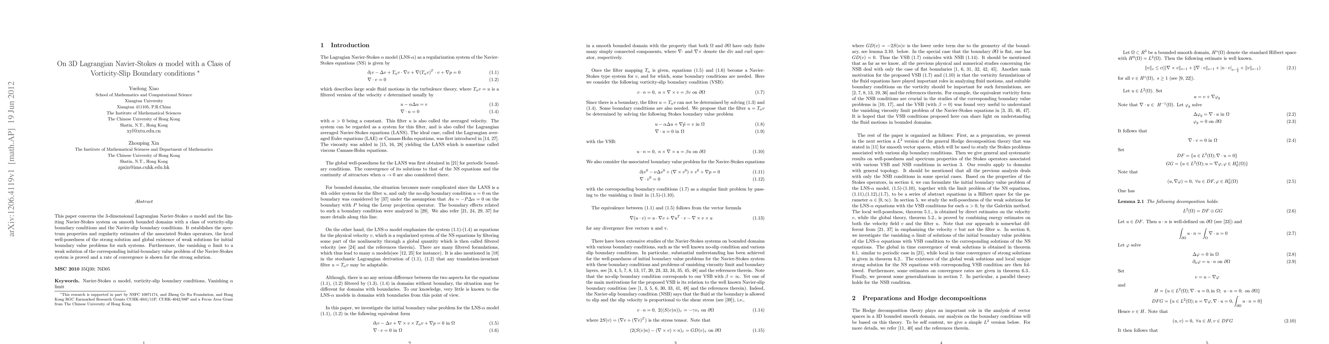 This paper investigates the 3D Lagrangian Navier-Stokes $\alpha$ model with vorticity-slip boundary conditions, establishing spectrum properties and regularity estimates for associated Stokes operators, and proving local well-posedness and global existence of weak solutions. It also demonstrates the vanishing $\alpha$ limit to the Navier-Stokes system and provides a rate of convergence for the strong solution.