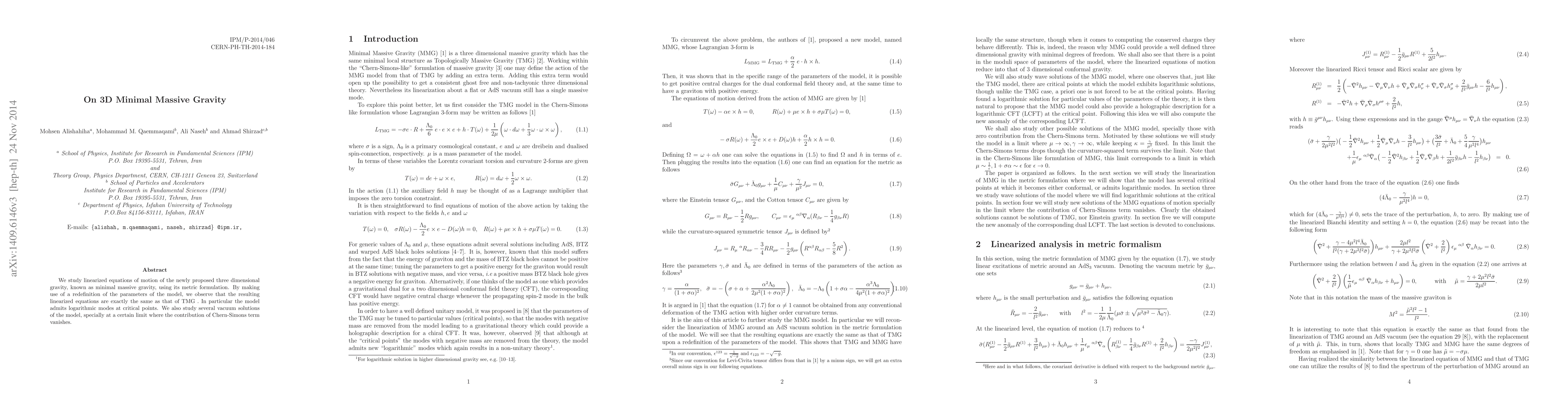 This paper investigates linearized equations of 3D minimal massive gravity, revealing they match those of TMG through a parameter redefinition. The model exhibits logarithmic modes at critical points and explores vacuum solutions, particularly when the Chern-Simons term contribution vanishes.