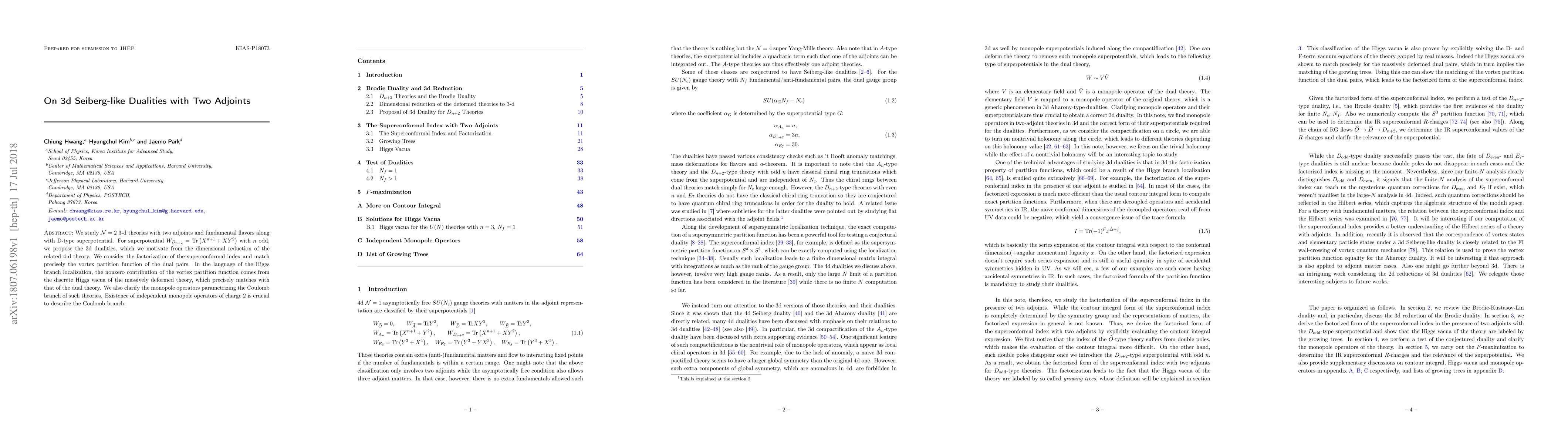 Researchers propose 3D dualities for N=2 theories with two adjoints and a specific superpotential, matching vortex partition functions and explaining Coulomb branch operators.