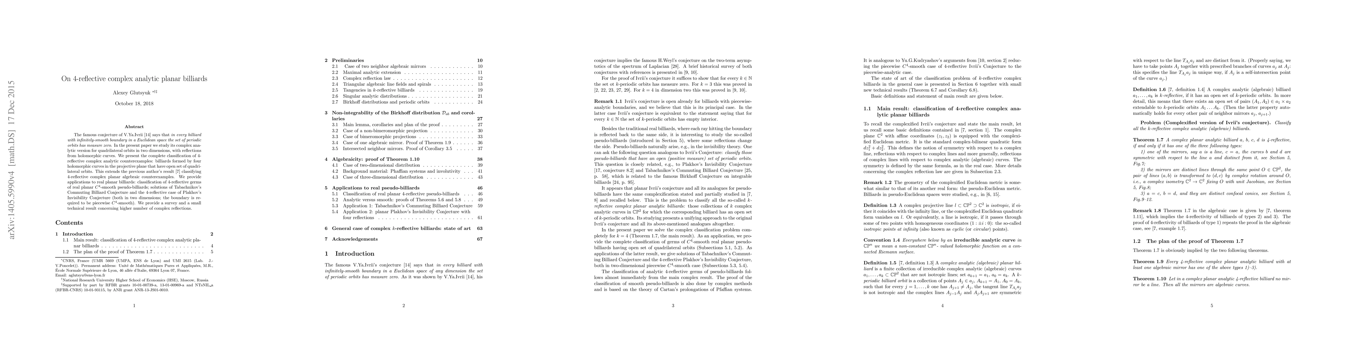 The famous conjecture of V.Ya.Ivrii says that {\it in every billiard with infinitely-smooth boundary in a Euclidean space the set of periodic orbits has measure zero}. In the present paper we study its complex analytic version for quadrilateral orbits in two dimensions, with reflections from holomorphic curves. We present the complete classification of 4-reflective complex analytic counterexamples: billiards formed by four holomorphic curves in the projective plane that have open set of quadrilateral orbits. This extends the previous author's result classifying 4-reflective complex planar algebraic counterexamples. We provide applications to real planar billiards: classification of 4-reflective germs of real planar $C^4$-smooth pseudo-billiards; solutions of Tabachnikov's Commuting Billiard Conjecture and the 4-reflective case of Plakhov's Invisibility Conjecture (both in two dimensions; the boundary is required to be piecewise $C^4$-smooth). We provide a survey and a small technical result concerning higher number of complex reflections.