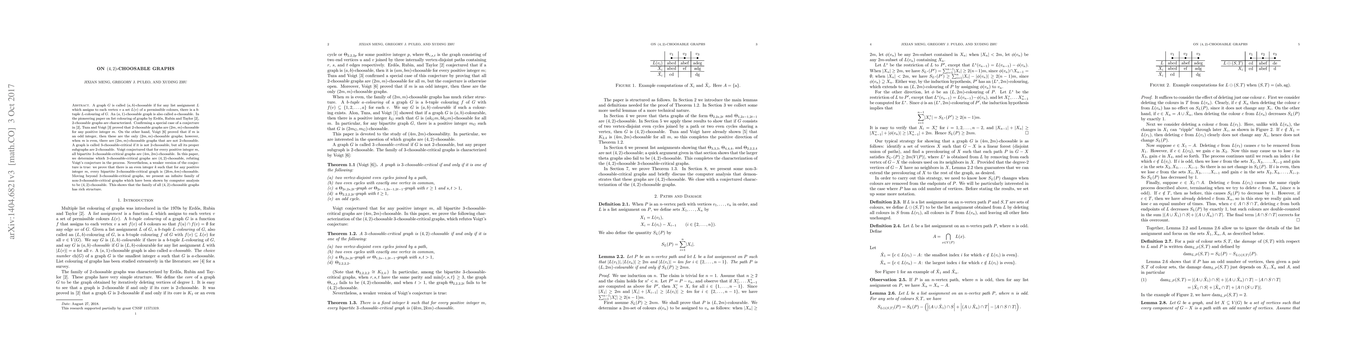 A graph $G$ is called $(a,b)$-choosable if for any list assignment $L$ which assigns to each vertex $v$ a set $L(v)$ of $a$ permissible colours, there is a $b$-tuple $L$-colouring of $G$. An $(a,1)$-choosable graph is also called $a$-choosable. In the pioneering paper on list colouring of graphs by Erd\H{o}s, Rubin and Taylor, $2$-choosable graphs are characterized. Confirming a special case of a conjecture of Erd\H{o}s--Rubin--Taylor, Tuza and Voigt proved that $2$-choosable graphs are $(2m,m)$-choosable for any positive integer $m$. On the other hand, Voigt proved that if $m$ is an odd integer, then these are the only $(2m,m)$-choosable graphs; however, when $m$ is even, there are $(2m,m)$-choosable graphs that are not $2$-choosable. A graph is called $3$-choosable-critical if it is not $2$-choosable, but all its proper subgraphs are $2$-choosable. Voigt conjectured that for every positive integer $m$, all bipartite $3$-choosable-critical graphs are $(4m,2m)$-choosable. In this paper, we determine which $3$-choosable-critical graphs are $(4,2)$-choosable, refuting Voigt's conjecture in the process. Nevertheless, a weaker version of the conjecture is true: we prove that there is an even integer $k$ such that for any positive integer $m$, every bipartite $3$-choosable-critical graph is $(2km,km)$-choosable. Moving beyond $3$-choosable-critical graphs, we present an infinite family of non-$3$-choosable-critical graphs which have been shown by computer analysis to be $(4,2)$-choosable. This shows that the family of all $(4,2)$-choosable graphs has rich structure.