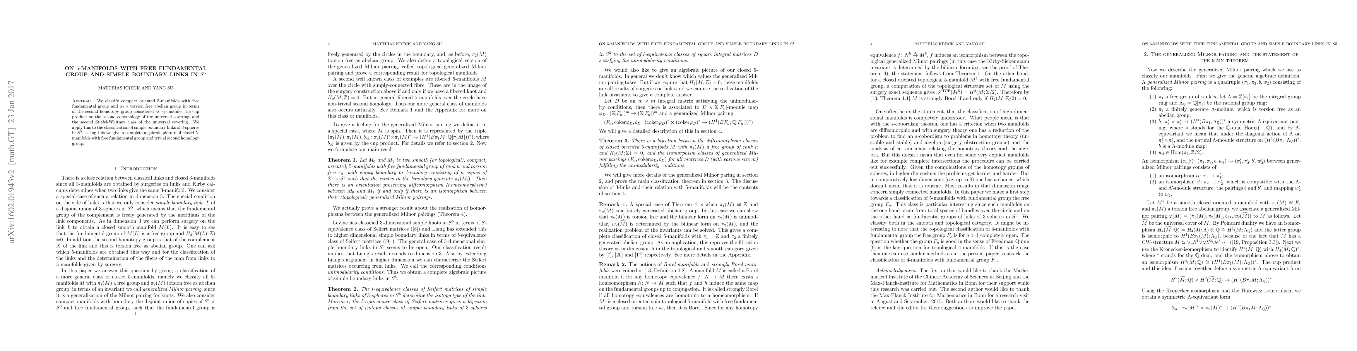 This paper classifies compact oriented 5-manifolds with a free fundamental group and torsion-free second homology group, using the second homotopy group as a $\pi_1$-module, the cup product, and the second Stiefel-Whitney class. It also applies these classifications to the study of simple boundary links of 3-spheres in $S^5$.