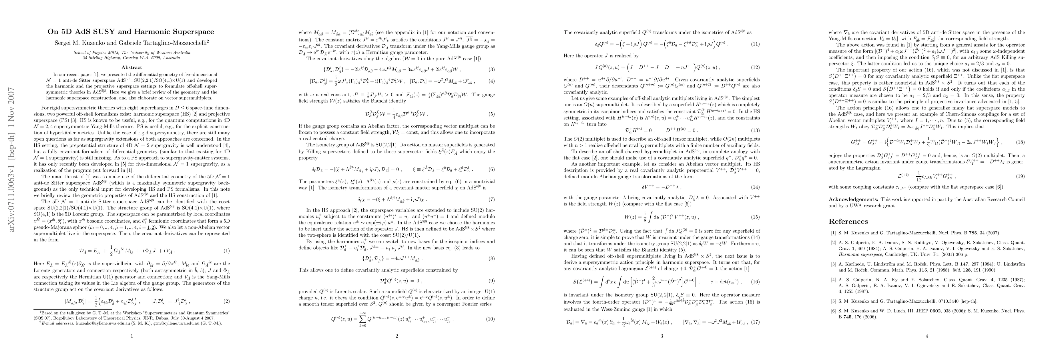 This paper reviews the differential geometry and harmonic superspace construction for five-dimensional N=1 anti-de Sitter superspace, emphasizing the SU(2,2|1)/SO(4,1) x U(1) structure, and elaborates on vector supermultiplets in the context of off-shell supersymmetric theories.