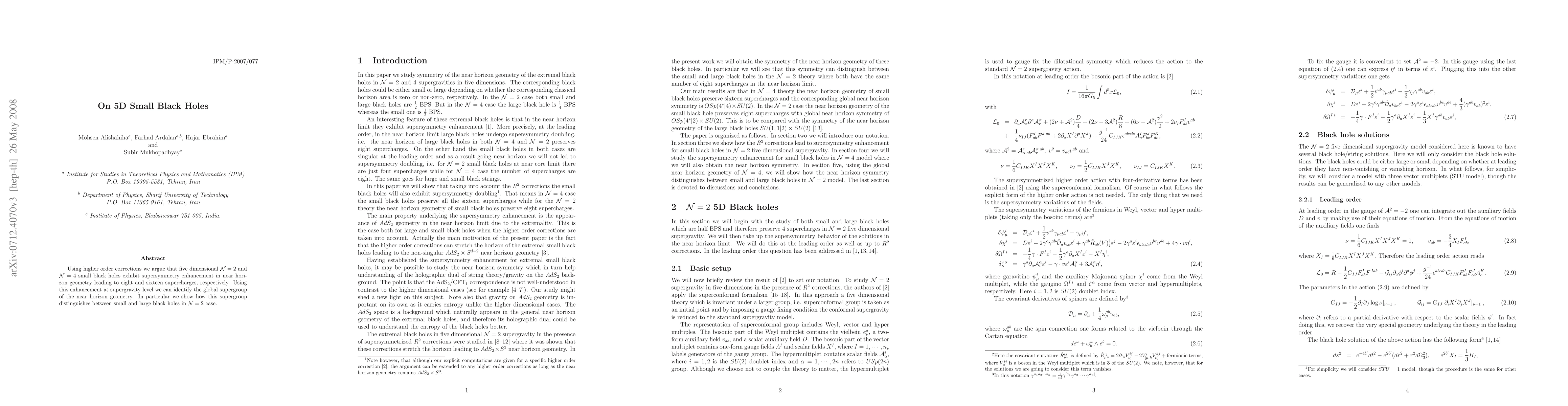 Using higher order corrections we argue that five dimensional N=2 and N=4 small black holes exhibit supersymmetry enhancement in near horizon geometry leading to eight and sixteen supercharges, respectively. Using this enhancement at supergravity level we can identify the global supergroup of the near horizon geometry. In particular we show how this supergroup distinguishes between small and large black holes in N=2 case.