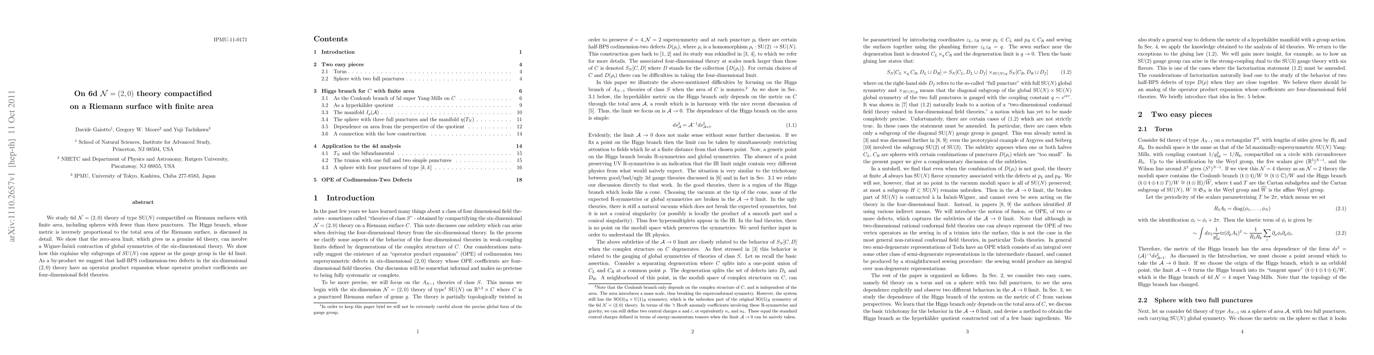 We study 6d N=(2,0) theory of type SU(N) compactified on Riemann surfaces with finite area, including spheres with fewer than three punctures. The Higgs branch, whose metric is inversely proportional to the total area of the Riemann surface, is discussed in detail. We show that the zero-area limit, which gives us a genuine 4d theory, can involve a Wigner-Inonu contraction of global symmetries of the six-dimensional theory. We show how this explains why subgroups of SU(N) can appear as the gauge group in the 4d limit. As a by-product we suggest that half-BPS codimension-two defects in the six-dimensional (2,0) theory have an operator product expansion whose operator product coefficients are four-dimensional field theories.
