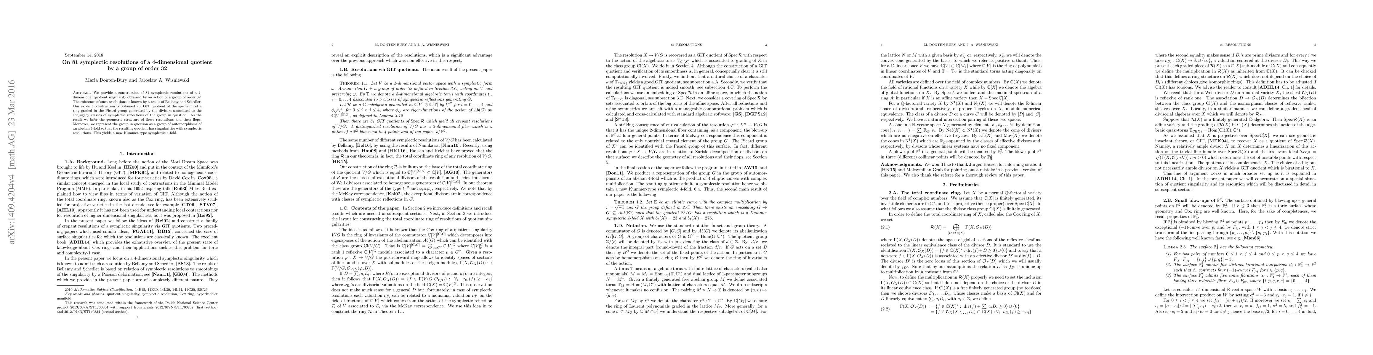We provide a construction of 81 symplectic resolutions of a 4-dimensional quotient singularity obtained by an action of a group of order 32. The existence of such resolutions is known by a result of Bellamy and Schedler. Our explicit construction is obtained via GIT quotient of the spectrum of a ring graded in the Picard group generated by the divisors associated to the conjugacy classes of symplectic reflections of the group in question. As the result we infer the geometric structure of these resolutions and their flops. Moreover, we represent the group in question as a group of automorphisms of an abelian 4-fold so that the resulting quotient has singularities with symplectic resolutions. This yields a new Kummer-type symplectic 4-fold.