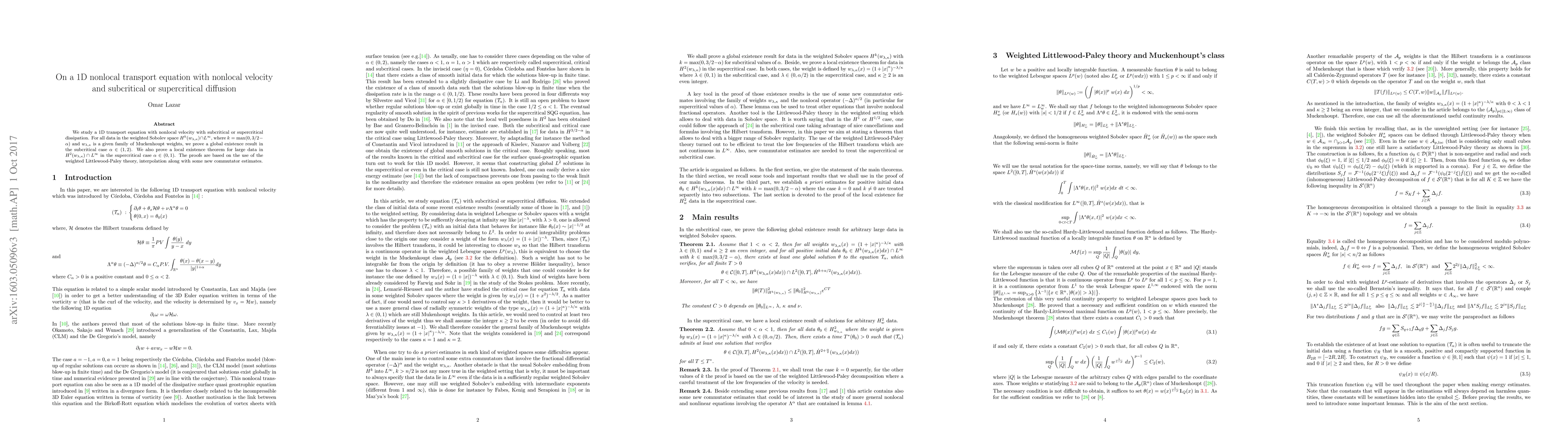 This paper investigates a 1D transport equation with nonlocal velocity and either subcritical or supercritical diffusion. It establishes global existence for subcritical diffusion and local existence for large data in the supercritical case, utilizing weighted Sobolev spaces, Littlewood-Paley theory, and new commutator estimates.