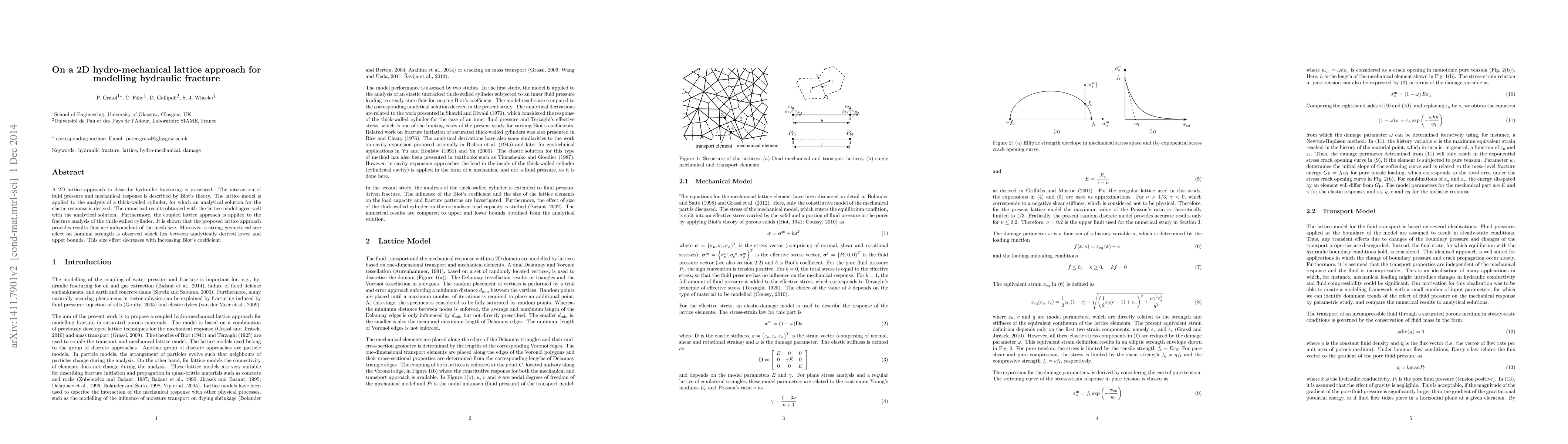 A 2D lattice approach to describe hydraulic fracturing is presented. The interaction of fluid pressure and mechanical response is described by Biot's theory. The lattice model is applied to the analysis of a thick-walled cylinder, for which an analytical solution for the elastic response is derived. The numerical results obtained with the lattice model agree well with the analytical solution. Furthermore, the coupled lattice approach is applied to the fracture analysis of the thick-walled cylinder. It is shown that the proposed lattice approach provides results that are independent of the mesh size. Moreover, a strong geometrical size effect on nominal strength is observed which lies between analytically derived lower and upper bounds. This size effect decreases with increasing Biot's coefficient.