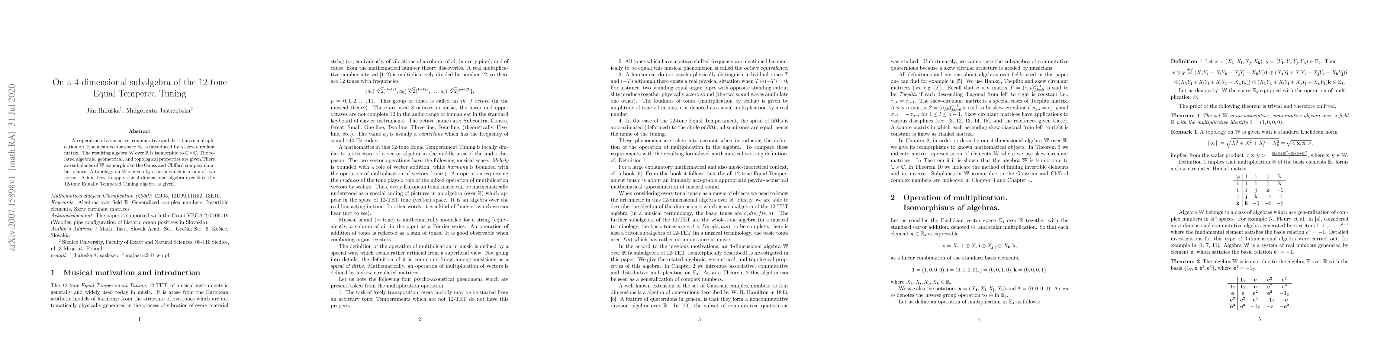 An operation of associative, commutative and distributive multiplication on { Euclidean vector space} $\mathbb{E}_4$ is introduced by a skew circulant matrix. The resulting algebra $\mathbb{W}$ over $\mathbb{R}$ is isomorphic to $\mathbb{C} \times \mathbb{C}.$ The related algebraic, geometrical, and topological properties are given.There are subplanes of $\mathbb{W}$ isomorphic to the Gauss and Clifford complex number planes. A topology on $\mathbb{W}$ is given by a norm which is a sum of two norms. A hint how to apply this 4 dimensional algebra over $\mathbb{R}$ to the 12-tone Equally Tempered Tuning algebra is given.