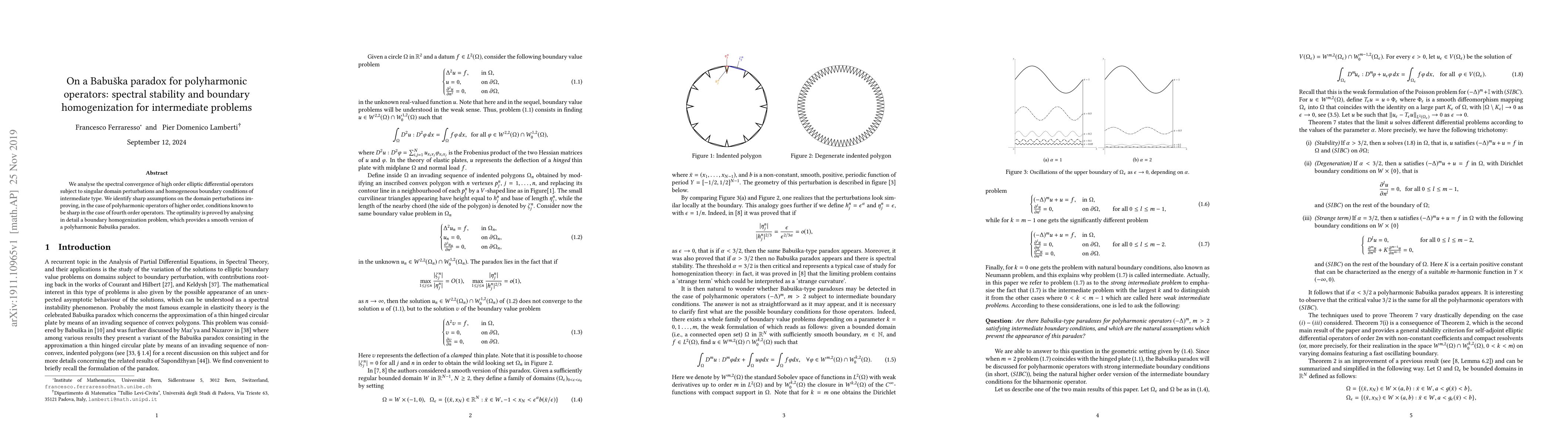 This paper investigates the spectral convergence of high-order elliptic differential operators under singular domain perturbations and intermediate boundary conditions, identifying sharp conditions for spectral stability. The study also resolves a boundary homogenization problem to demonstrate the optimality of these conditions, addressing a polyharmonic Babuška paradox.