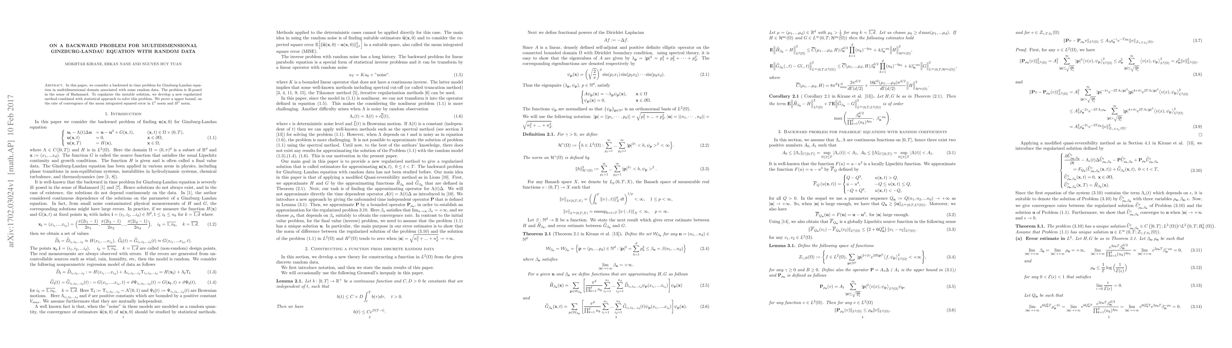 Researchers developed a method to solve an ill-posed problem in Ginzburg-Landau equation with random data, using a regularized approach combined with statistics, and showed a bound on the rate of convergence.
