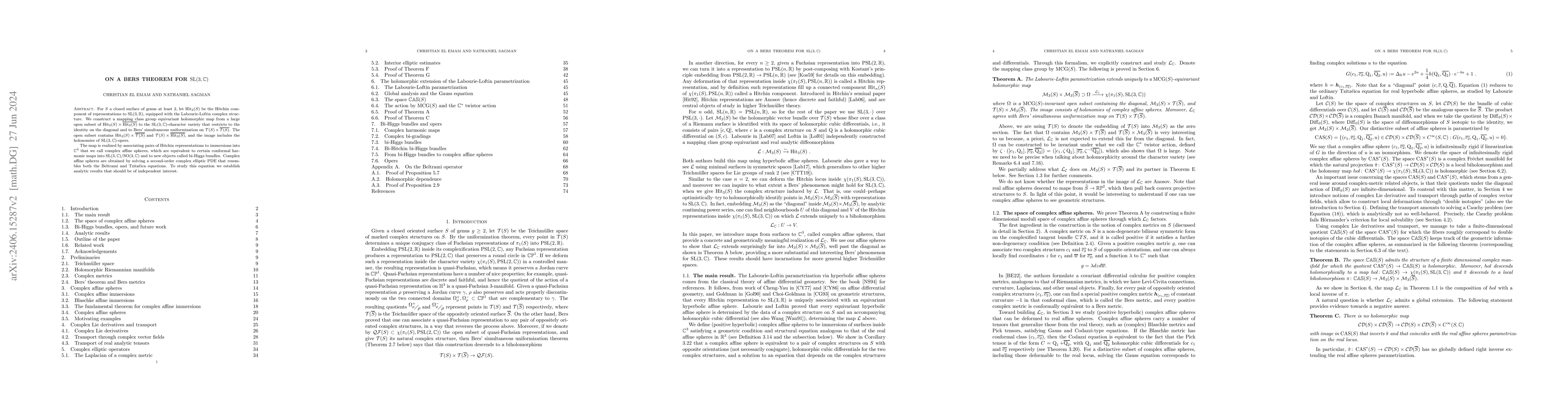 For $S$ a closed surface of genus at least $2$, let $\mathrm{Hit}_3(S)$ be the Hitchin component of representations to $\mathrm{SL}(3,\mathbb{R}),$ equipped with the Labourie-Loftin complex structure. We construct a mapping class group equivariant holomorphic map from a large open subset of $\mathrm{Hit}_3(S)\times \overline{\mathrm{Hit}_3(S)}$ to the $\mathrm{SL}(3,\mathbb{C})$-character variety that restricts to the identity on the diagonal and to Bers' simultaneous uniformization on $\mathcal{T}(S)\times \overline{\mathcal{T}(S)}$. The open subset contains $\mathrm{Hit}_3(S)\times \overline{\mathcal{T}(S)}$ and $\mathcal{T}(S)\times \overline{\mathrm{Hit}_3(S)}$, and the image includes the holonomies of $\mathrm{SL}(3,\mathbb{C})$-opers. The map is realized by associating pairs of Hitchin representations to immersions into $\mathbb{C}^3$ that we call complex affine spheres, which are equivalent to certain conformal harmonic maps into $\mathrm{SL}(3,\mathbb{C})/\mathrm{SO}(3,\mathbb{C})$ and to new objects called bi-Higgs bundles. Complex affine spheres are obtained by solving a second-order complex elliptic PDE that resembles both the Beltrami and Tzitz\'eica equations. To study this equation we establish analytic results that should be of independent interest.