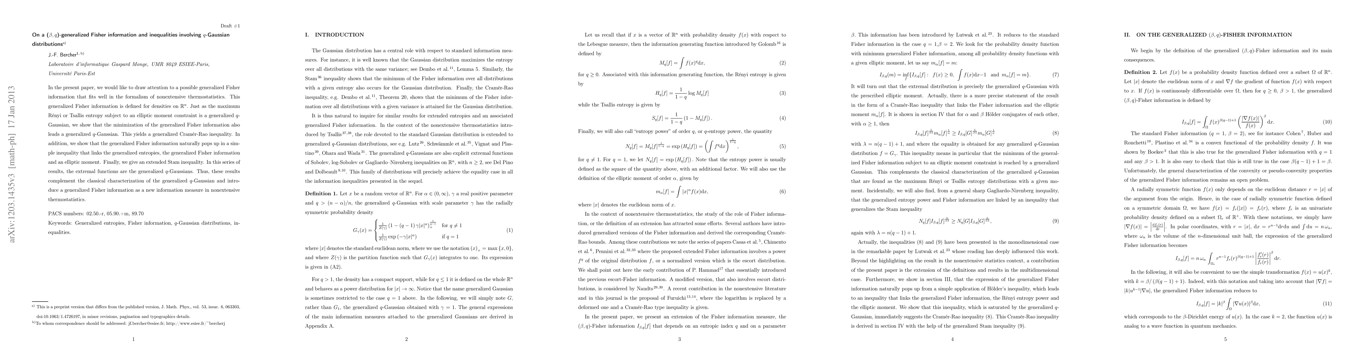 This paper introduces a (\beta,q)-generalized Fisher information measure in nonextensive thermostatistics, showing its connection to generalized q-Gaussian distributions and deriving a generalized Cramér-Rao inequality. The study also establishes a new inequality linking generalized entropies, Fisher information, and elliptic moments, with generalized q-Gaussians as extremal functions.