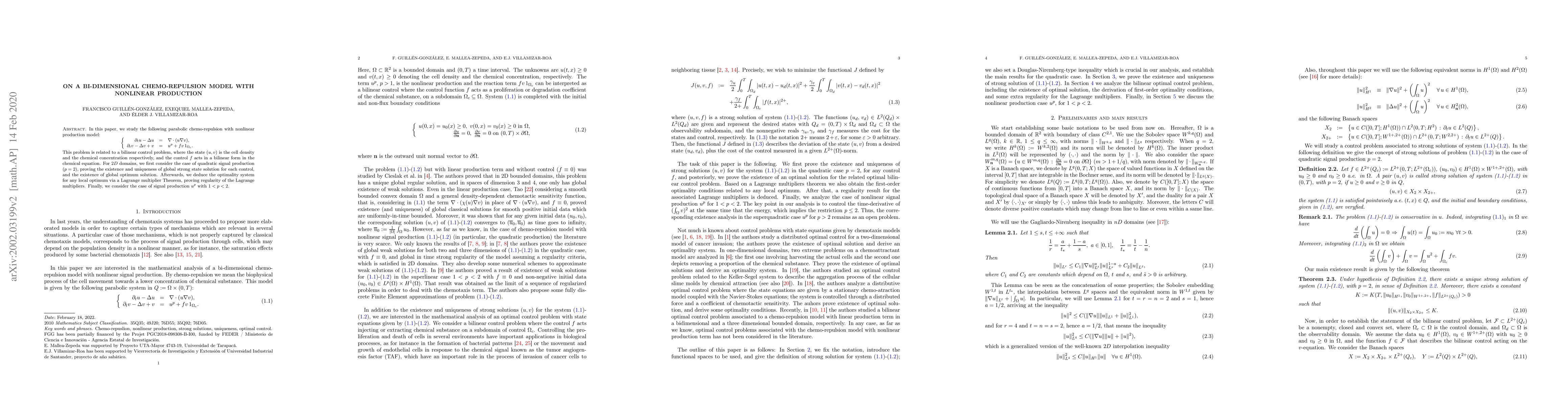 In this paper, we study the following parabolic chemo-repulsion with nonlinear production model: $$ \left\{ \begin{array}{rcl} \partial_tu-\Delta u&=&\nabla\cdot(u\nabla v),\\ \partial_tv-\Delta v+v&=&u^p+fv\, 1_{\Omega_c}. \end{array} \right. $$ This problem is related to a bilinear control problem, where the state $(u,v)$ is the cell density and the chemical concentration respectively, and the control $f$ acts in a bilinear form in the chemical equation. For $2D$ domains, we first consider the case of quadratic signal production ($p=2$), proving the existence and uniqueness of global strong state solution for each control, and the existence of global optimum solution. Afterwards, we deduce the optimality system for any local optimum via a Lagrange multiplier Theorem, proving regularity of the Lagrange multipliers. Finally, we consider the case of signal production $u^p$ with $1