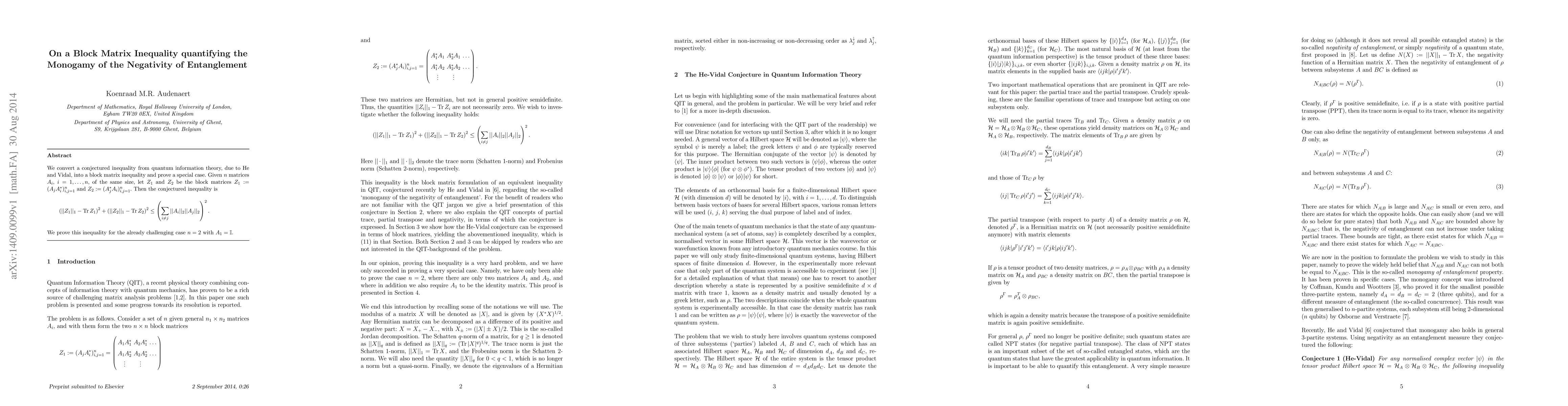 We convert a conjectured inequality from quantum information theory, due to He and Vidal, into a block matrix inequality and prove a special case. Given $n$ matrices $A_i$, $i=1,\ldots,n$, of the same size, let $Z_1$ and $Z_2$ be the block matrices $Z_1:=(A_jA_i^*)_{i,j=1}^n$ and $Z_2:=(A_j^*A_i)_{i,j=1}^n$. Then the conjectured inequality is \[ \left(||Z_1||_1-\trace Z_1\right)^2 + \left(||Z_2||_1-\trace Z_2\right)^2 \le \left(\sum_{i\neq j} ||A_i||_2 ||A_j||_2\right)^2. \] We prove this inequality for the already challenging case $n=2$ with $A_1$ equal to the identity matrix.