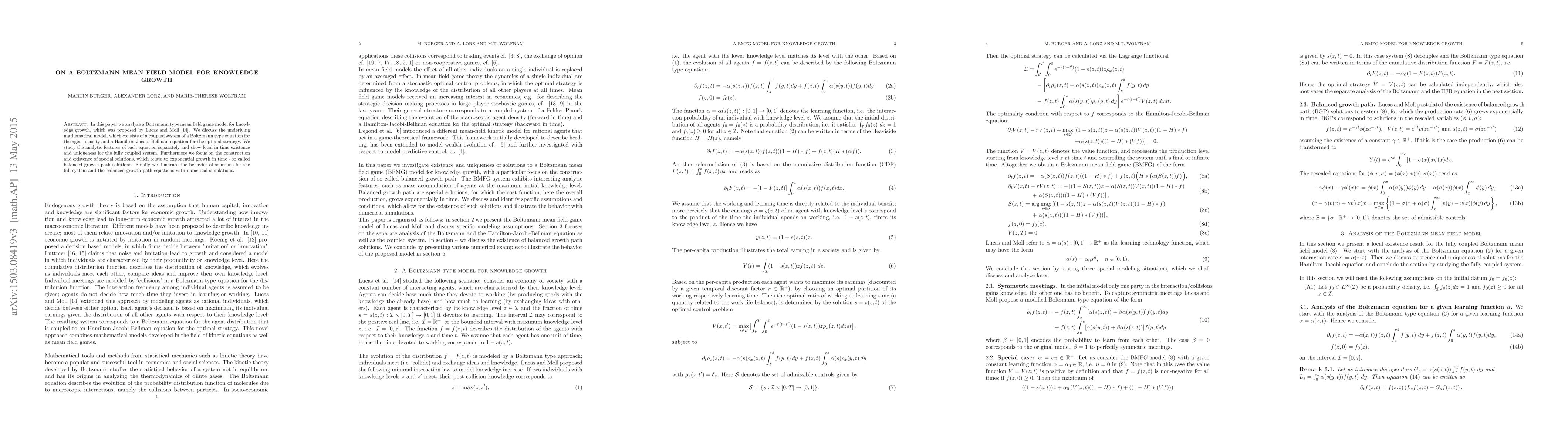 Researchers analyzed a mathematical model for knowledge growth using a Boltzmann mean field game, showing that local in time existence and uniqueness exist for the coupled system, as well as solutions related to exponential growth.
