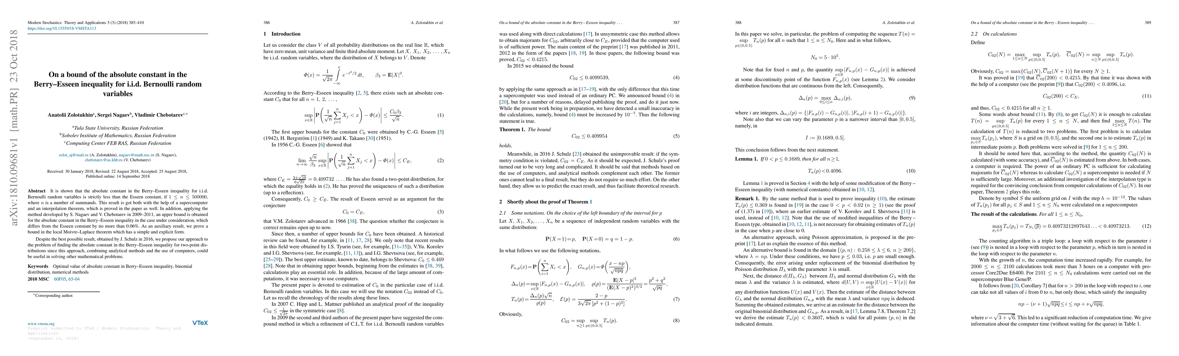 This paper establishes that the absolute constant in the Berry-Esseen inequality for i.i.d. Bernoulli random variables is strictly less than the Esseen constant for $1\le n\le 500000$. The result is achieved using a supercomputer, an interpolation theorem, and a method developed by Nagaev and Chebotarev.